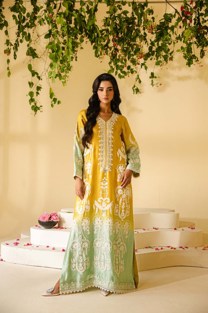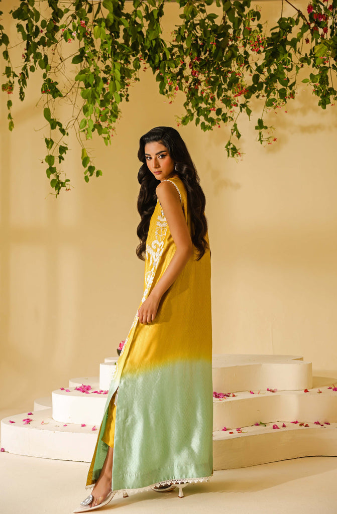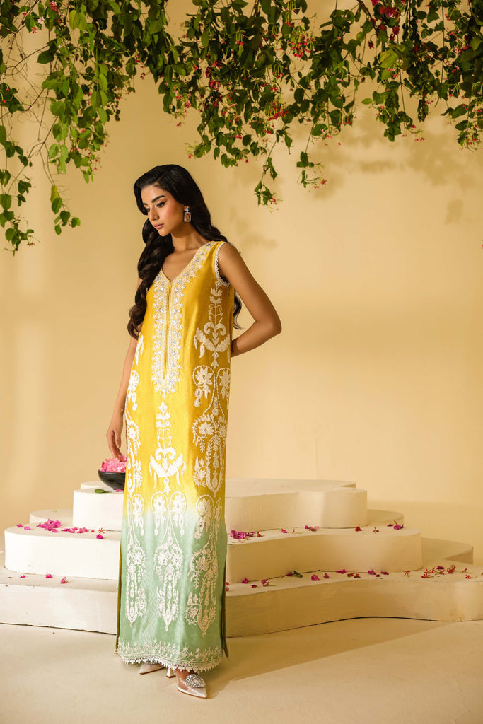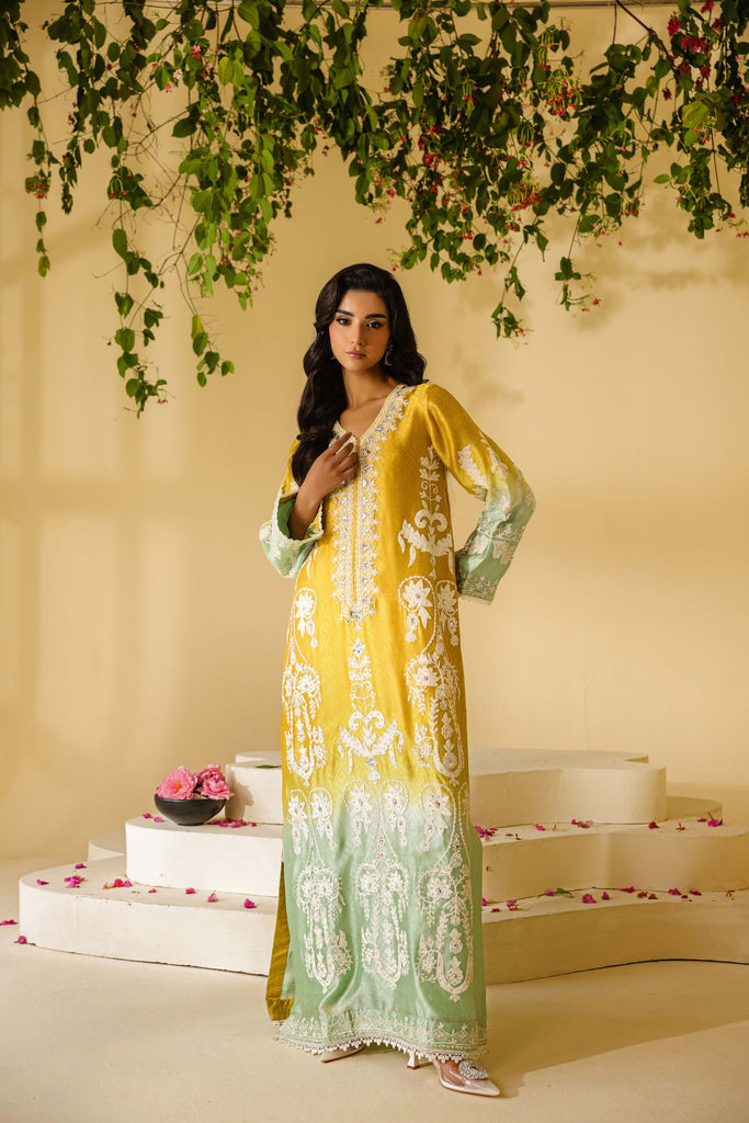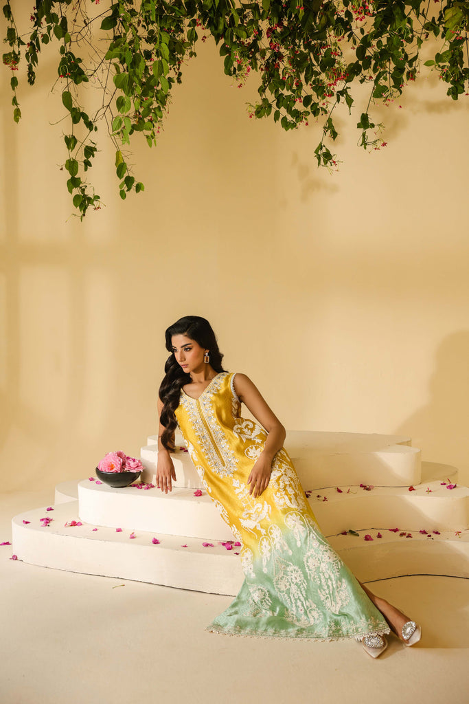 Ombre dyed Self textured Sheesha Silk with ivory aari embroidery all over the front and sleeves. Hand embellishments all over the embroidery with rhinestones, pearls and sequins. Lace finishing on daaman and sleeves and tassel detailing in slits. Paired with pure mustard sheesha silk capri pants.