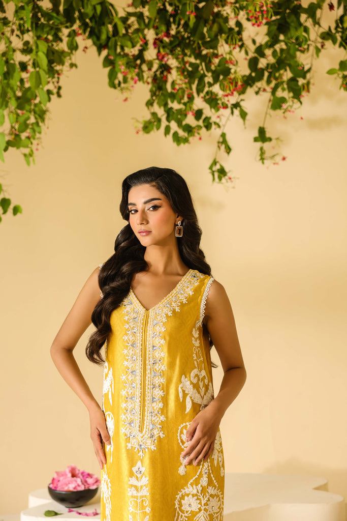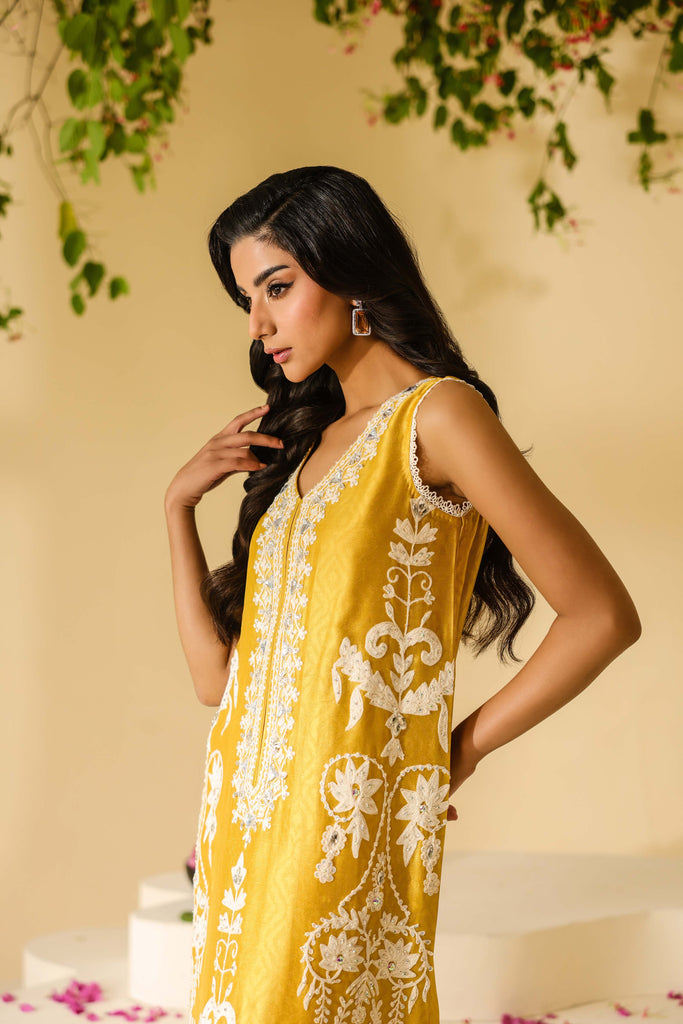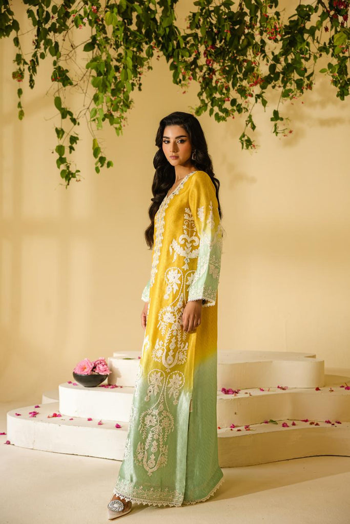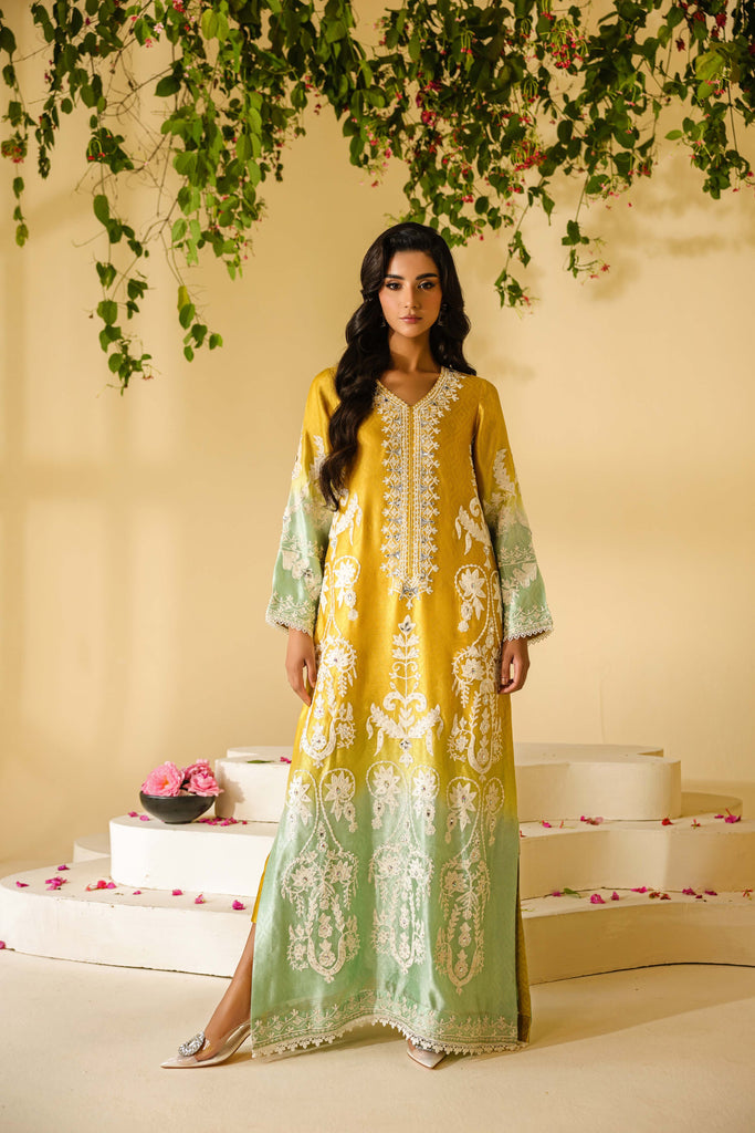 Ombre dyed Self textured Sheesha Silk with ivory aari embroidery all over the front and sleeves. Hand embellishments all over the embroidery with rhinestones, pearls and sequins. Lace finishing on daaman and sleeves and tassel detailing in slits. Paired with pure mustard sheesha silk capri pants.