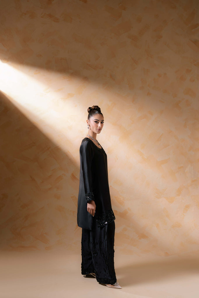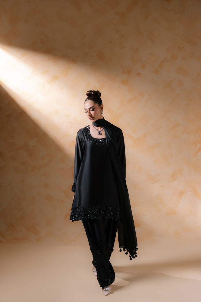 A pure sheesha silk shirt with intricate hand embellishments of kora, sequins, crystals, rhinestones and dabka. We love these heavy embellishments on its shalwar. Fully hand embellished with kora, dabka, cut daana, crystals, rhinestones and sequins. Paired with a pure medium silk dupatta with coin sequins.