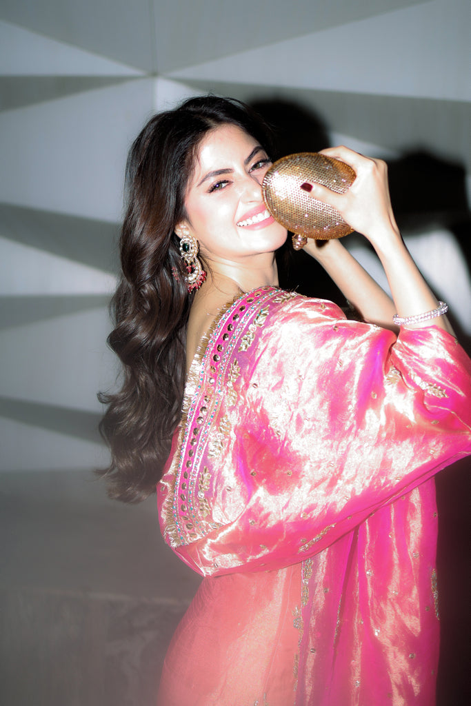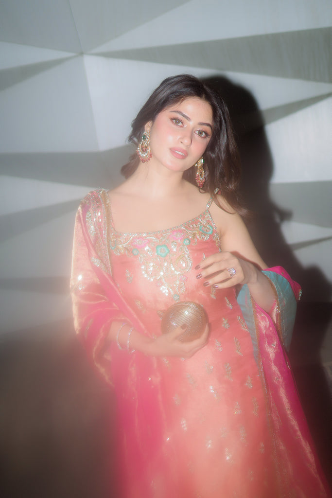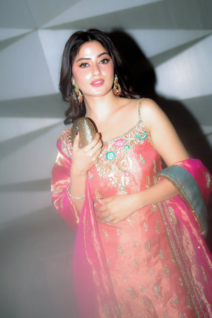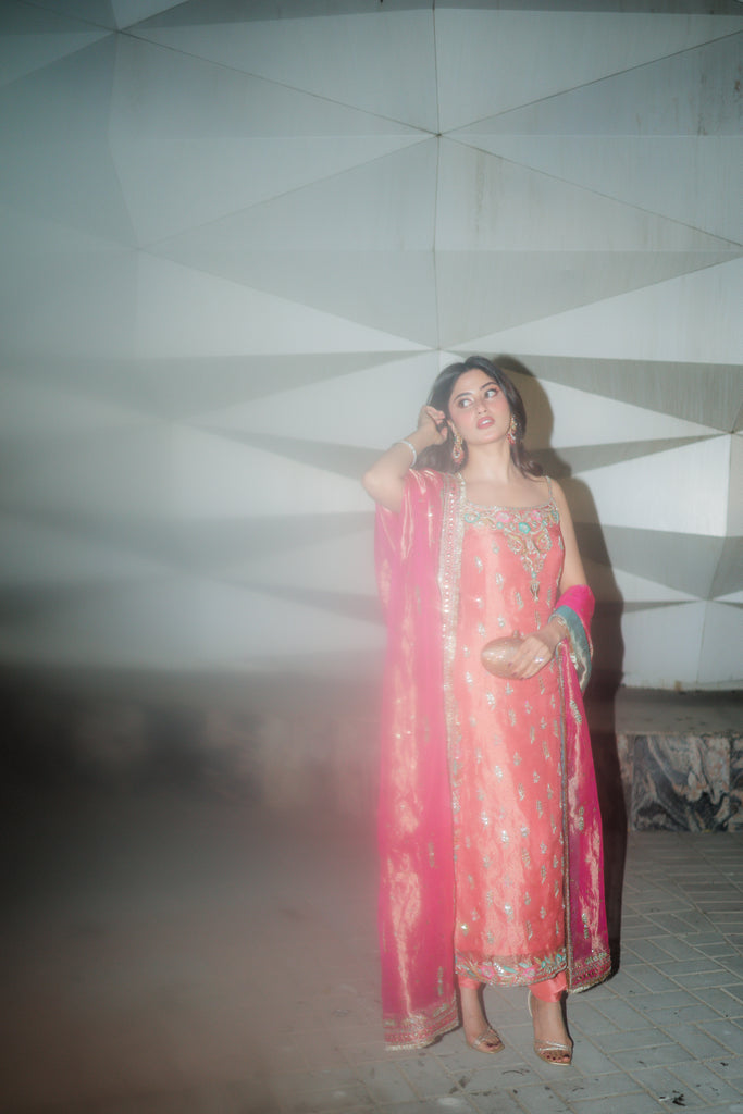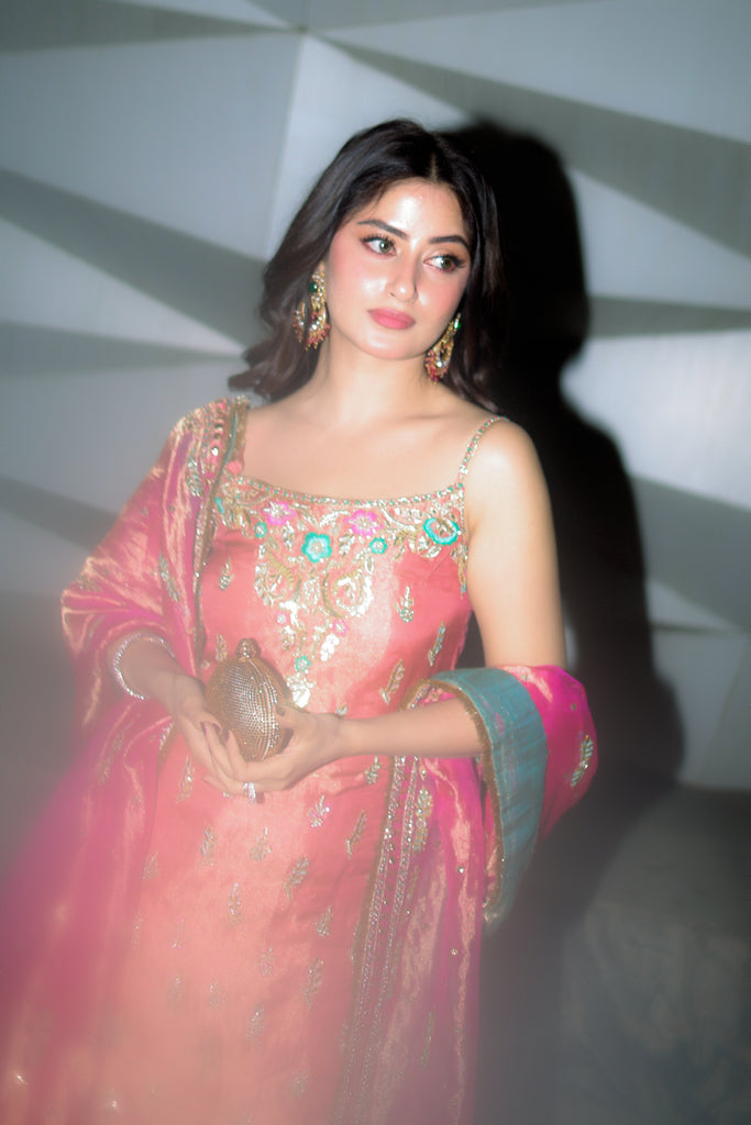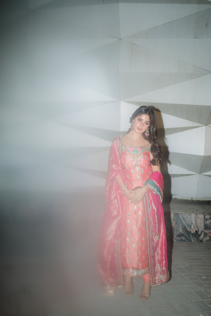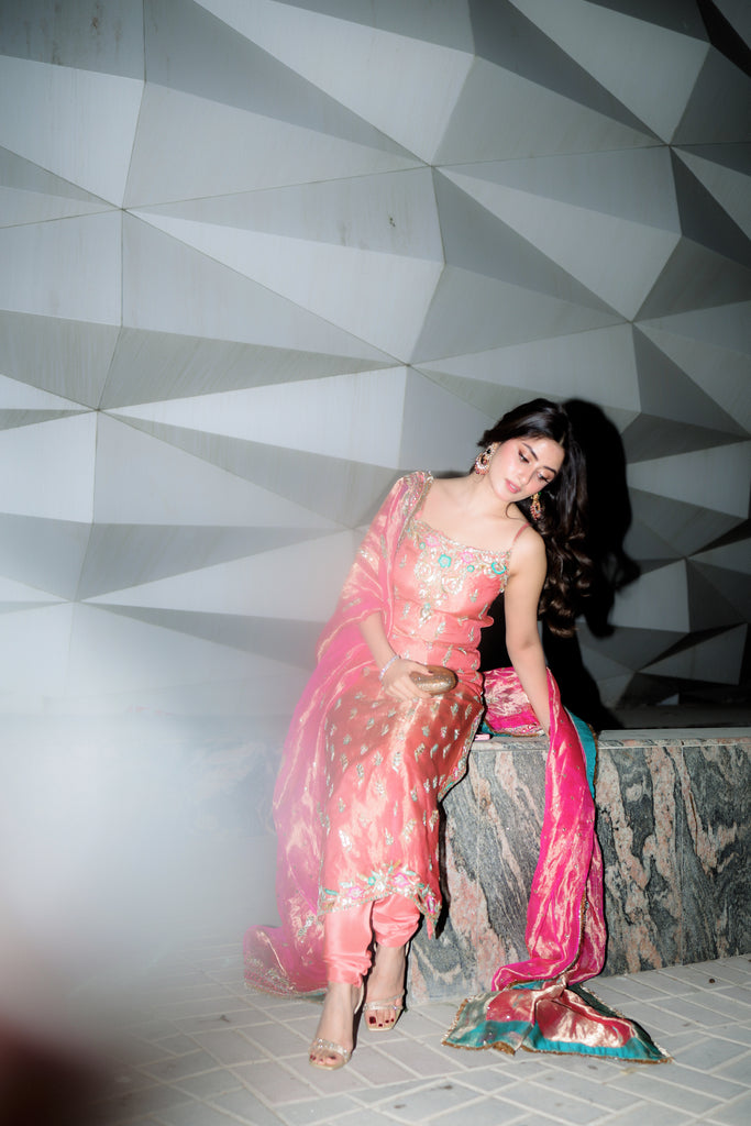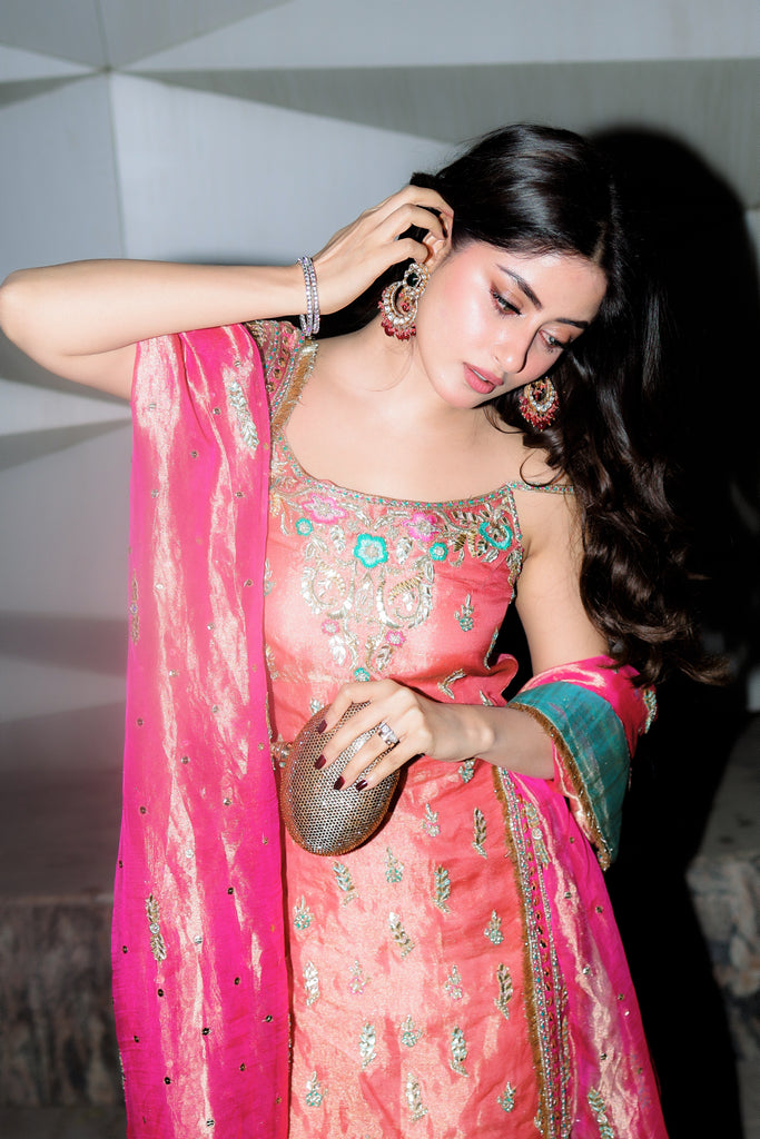 A pure gold tissue dupatta dyed in candy pink full of intricate hand embellishments. Kaamdaani, gota pati, kora dabka, nakshi, sequins, resham and rhinestones hand embellishments are on all four sides with spray. Finished with pure tissue and kiran detailing. Long copperish peach tissue shirt with the same hand work as dupatta all over the front and back. Paired with pure 80 gms rawsilk chooridaar.