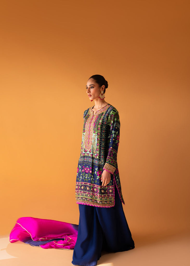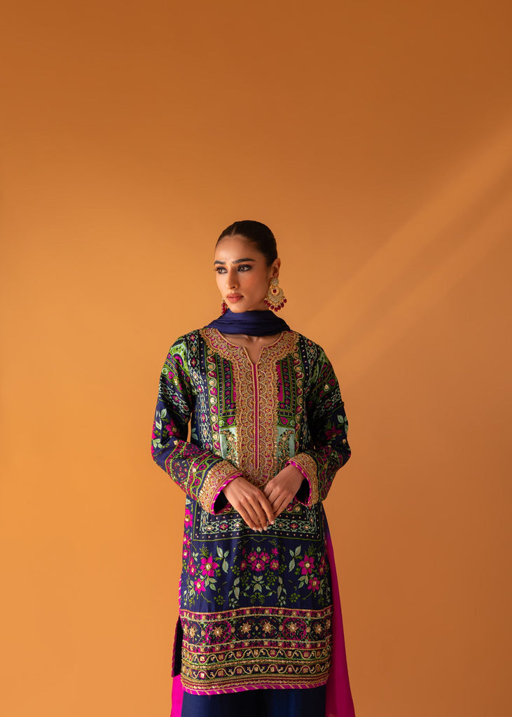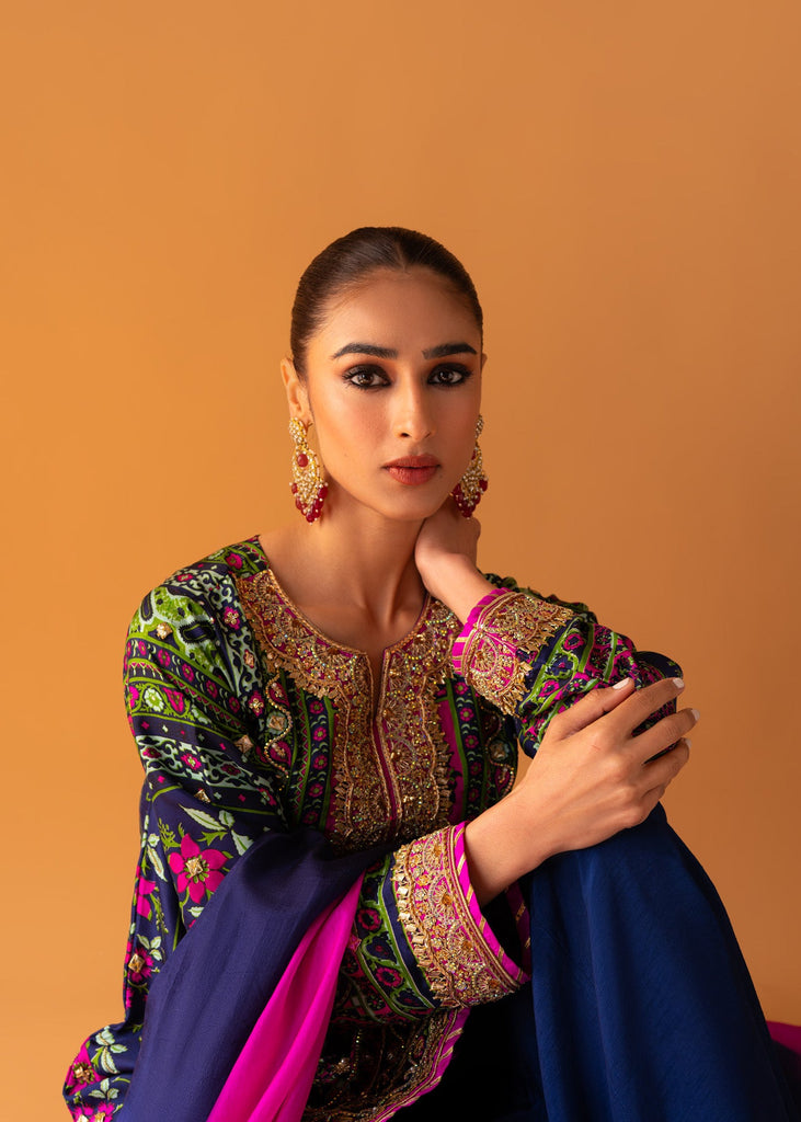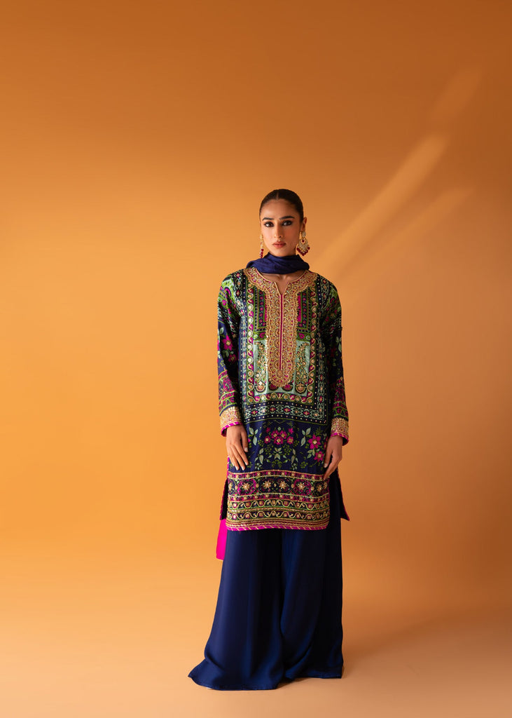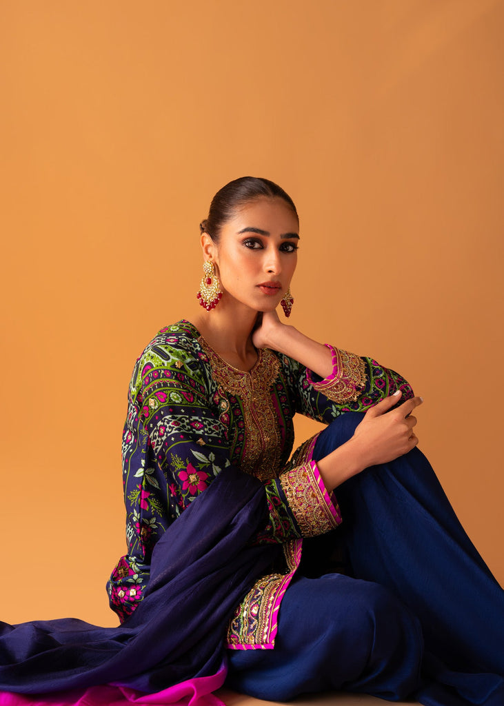 A pure medium silk screenprinted shirt with gorgeous appliquéd and hand embellished neckline and sleeves. Fora, kora dabka, sequins, rhinestones and resham. Paired with Korean rawsilk peplum pants.