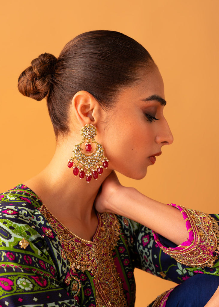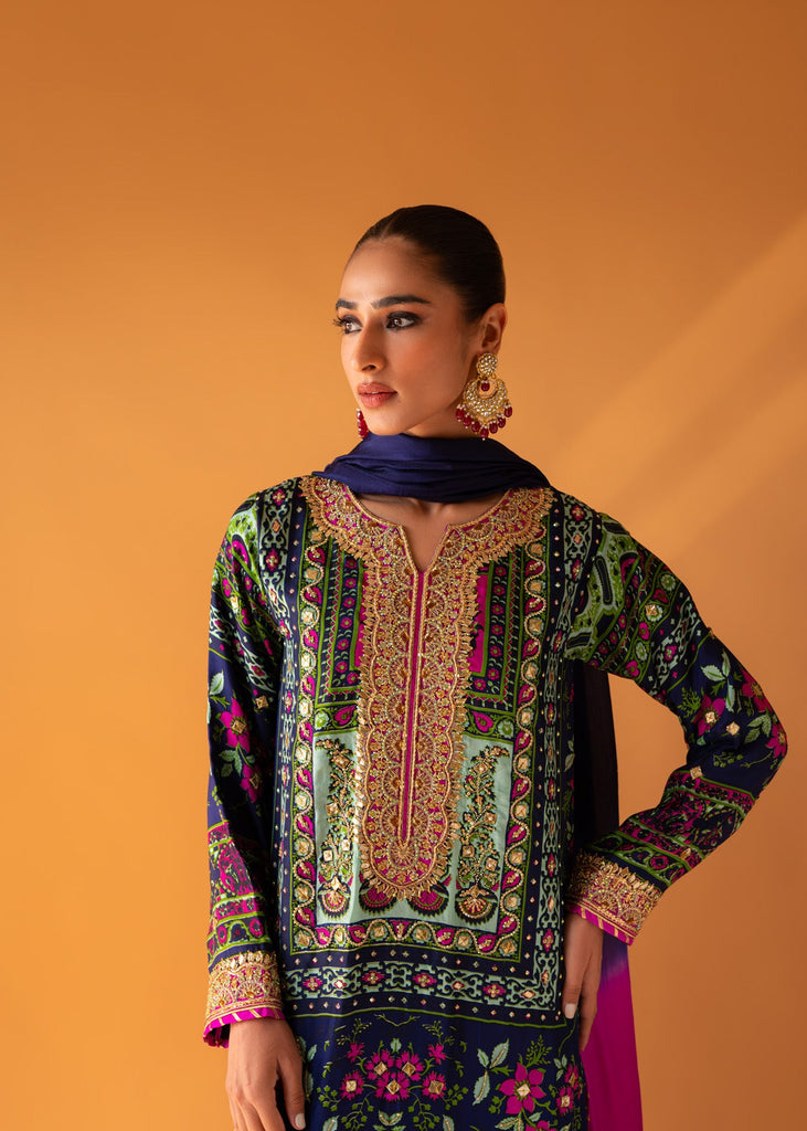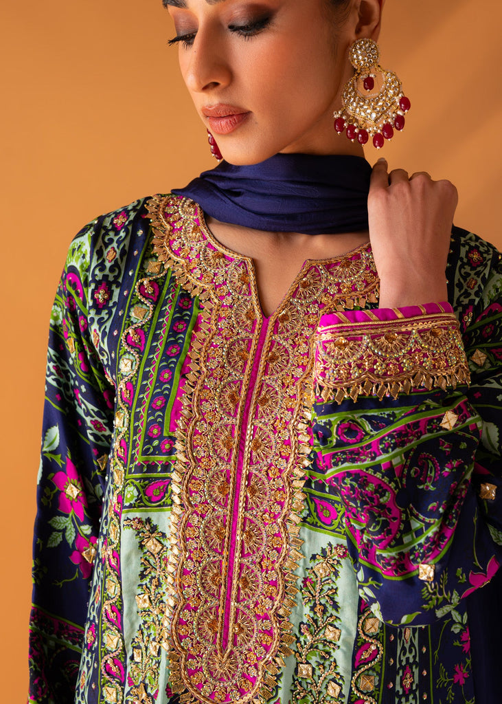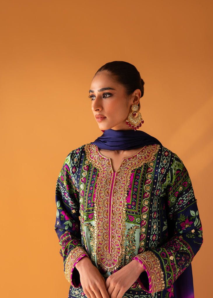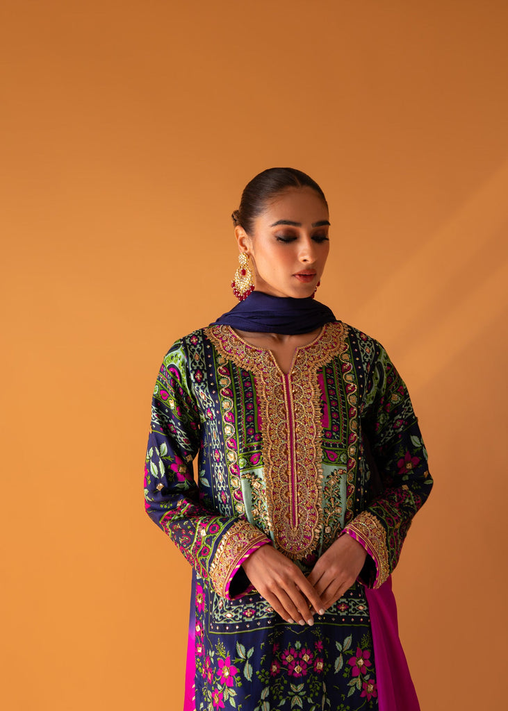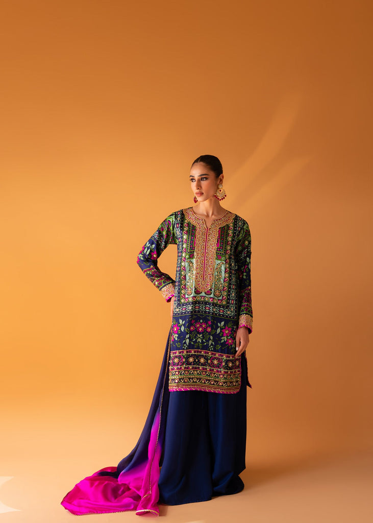 A pure medium silk screenprinted shirt with gorgeous appliquéd and hand embellished neckline and sleeves. Fora, kora dabka, sequins, rhinestones and resham. Paired with Korean rawsilk peplum pants.