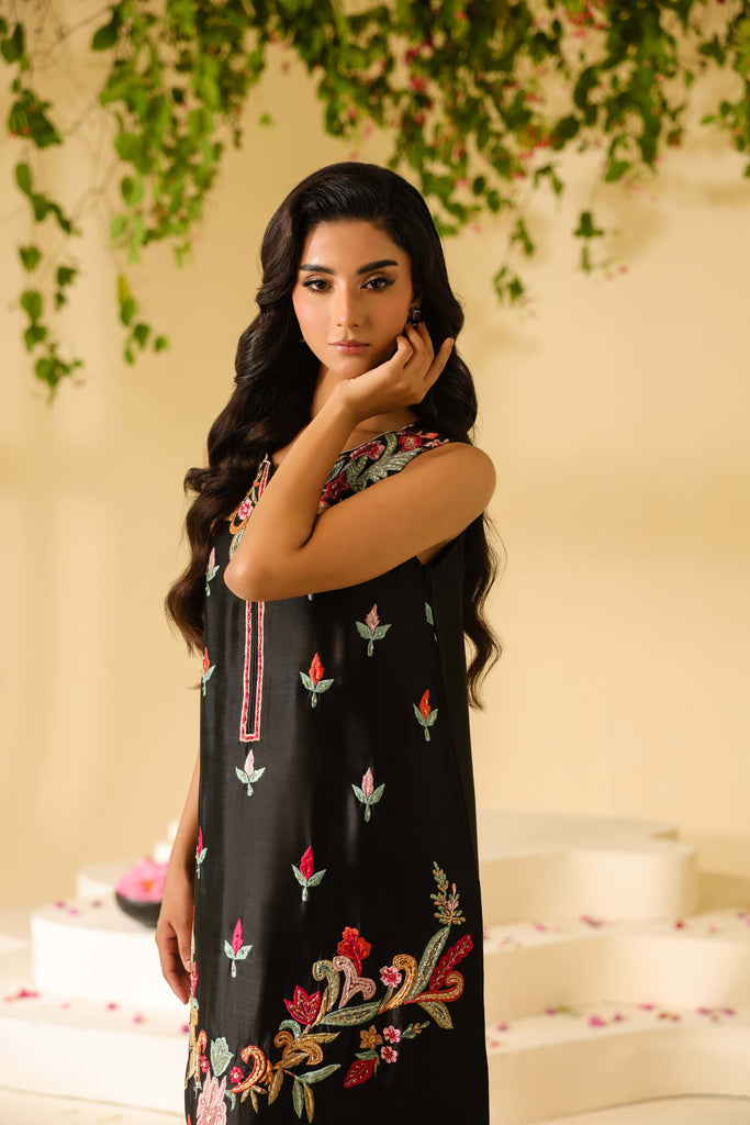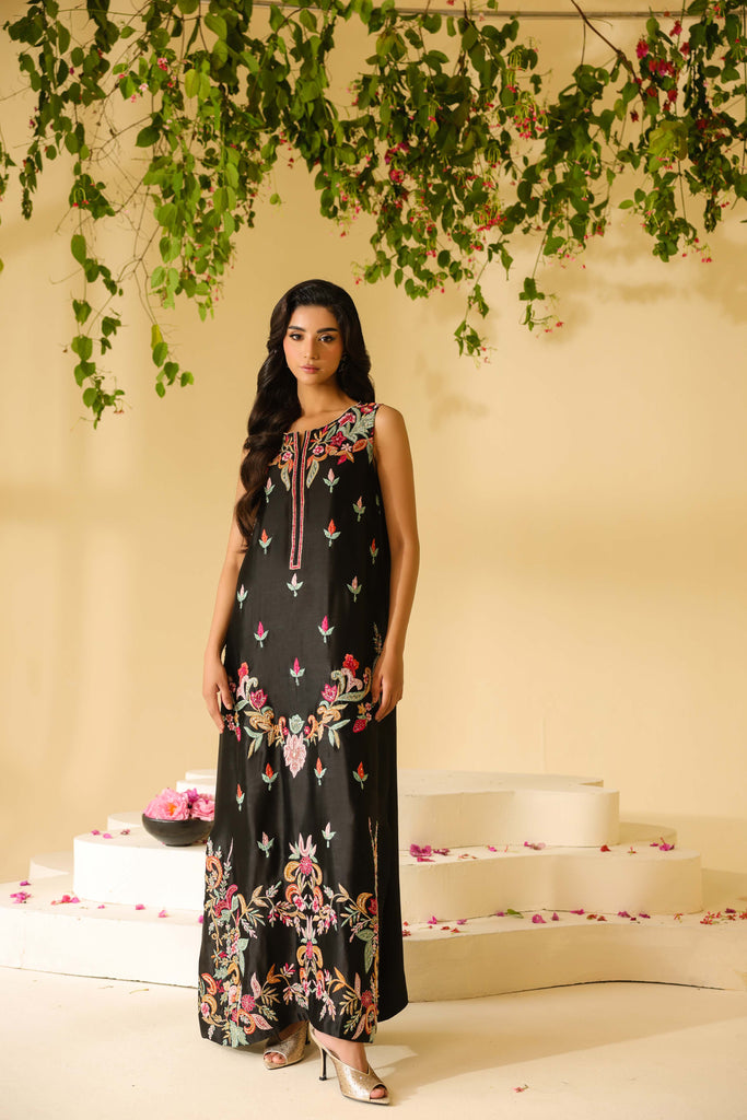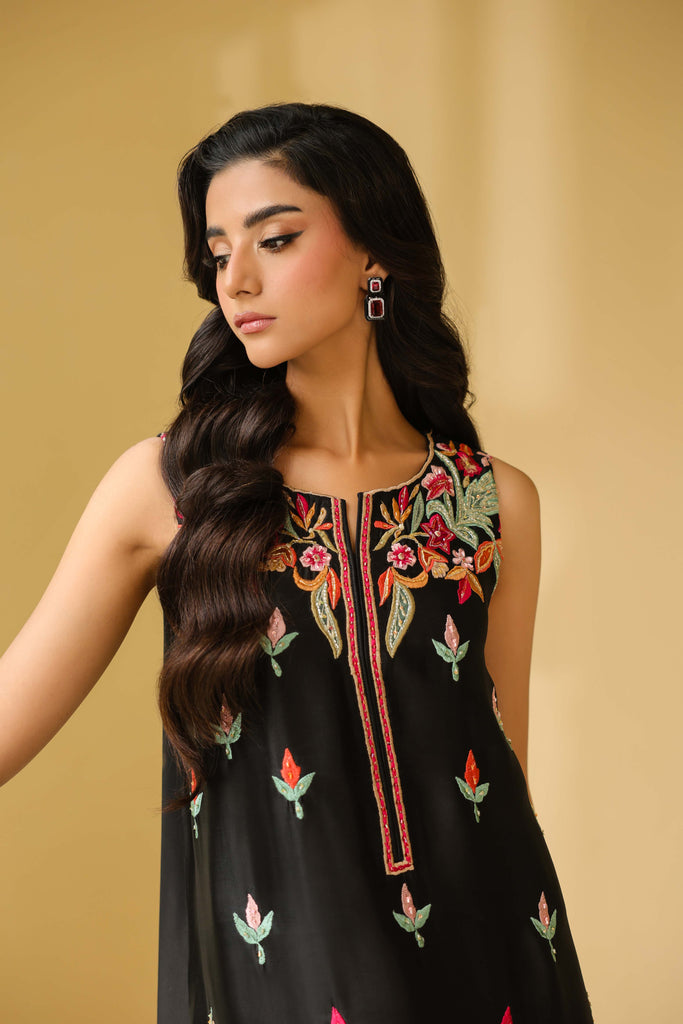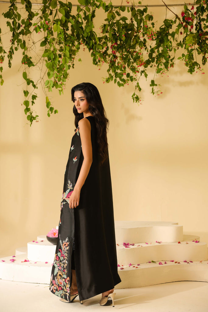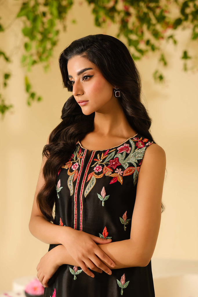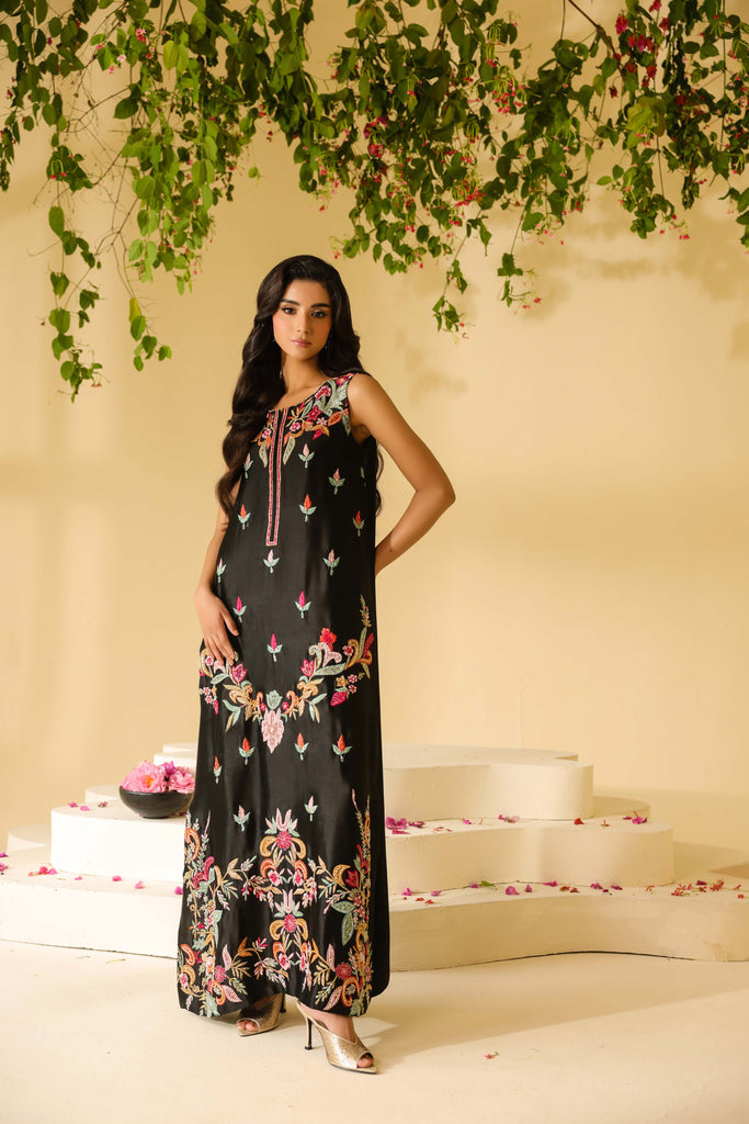 Pure sheesha silk black long maxi style shirt full of embroidery and applique work. Fully hand embellished front and sleeves. Cut daana, sequins and rhinestones. Paired with same sheesha silk capri pants.
