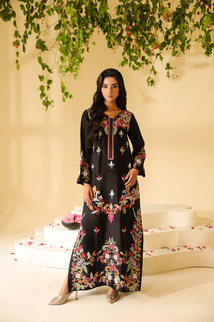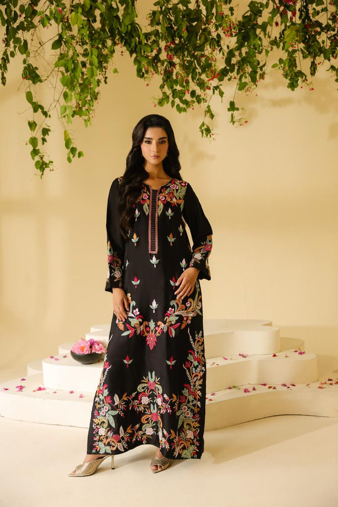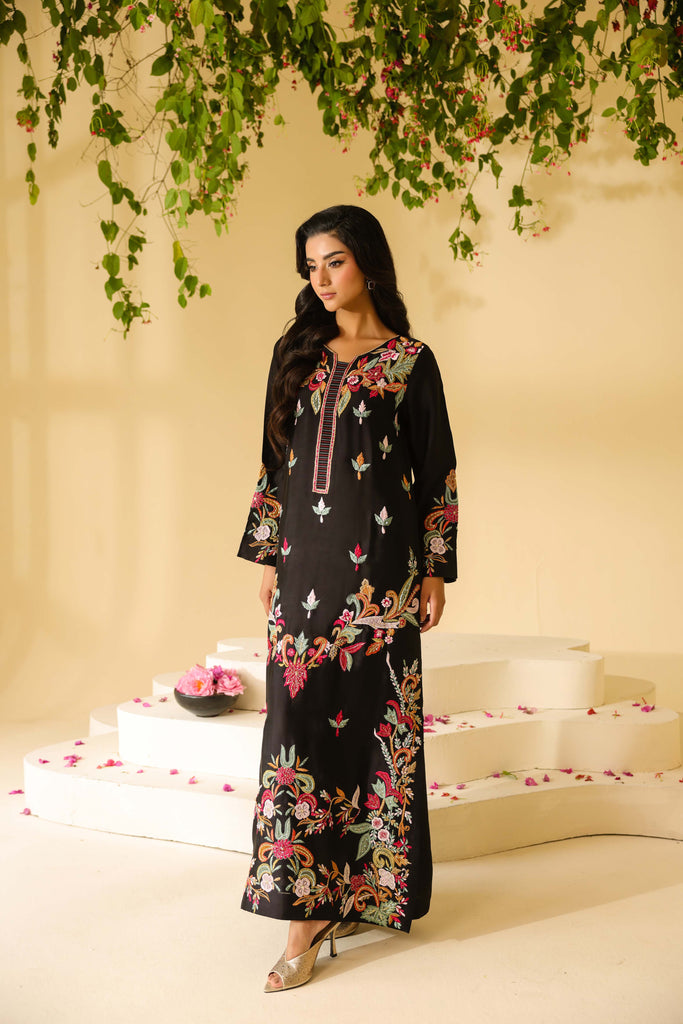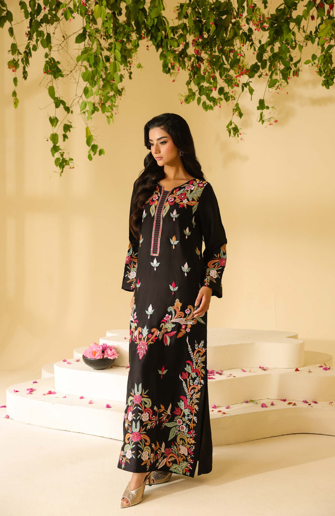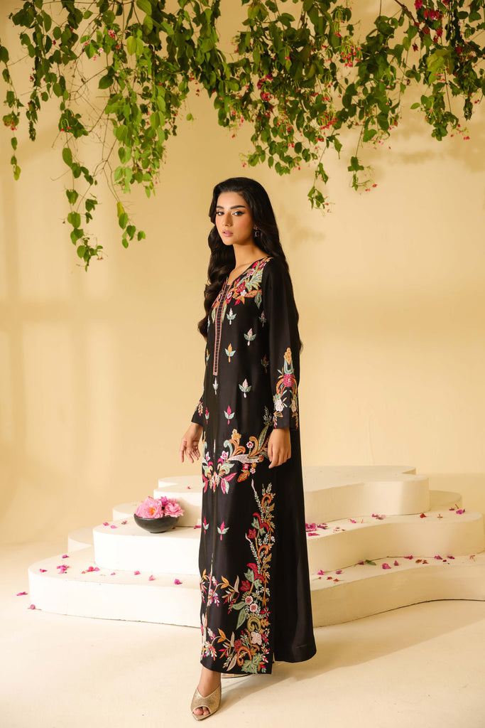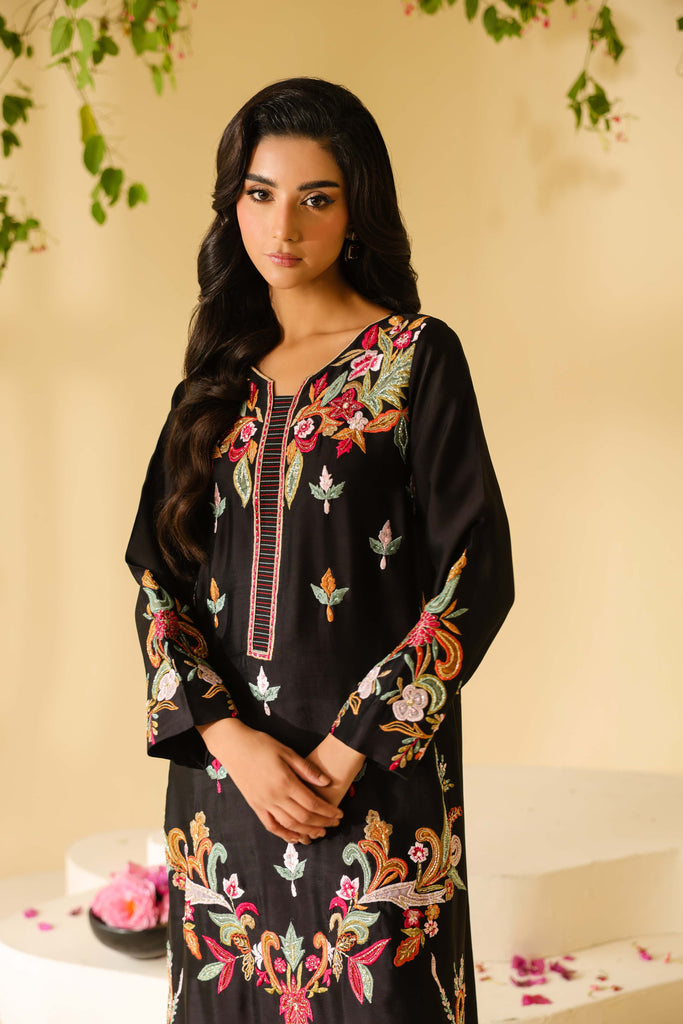 Pure sheesha silk black long maxi style shirt full of embroidery and applique work. Fully hand embellished front and sleeves. Cut daana, sequins and rhinestones. Paired with same sheesha silk capri pants.