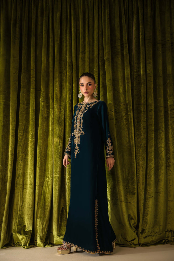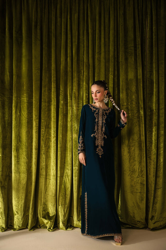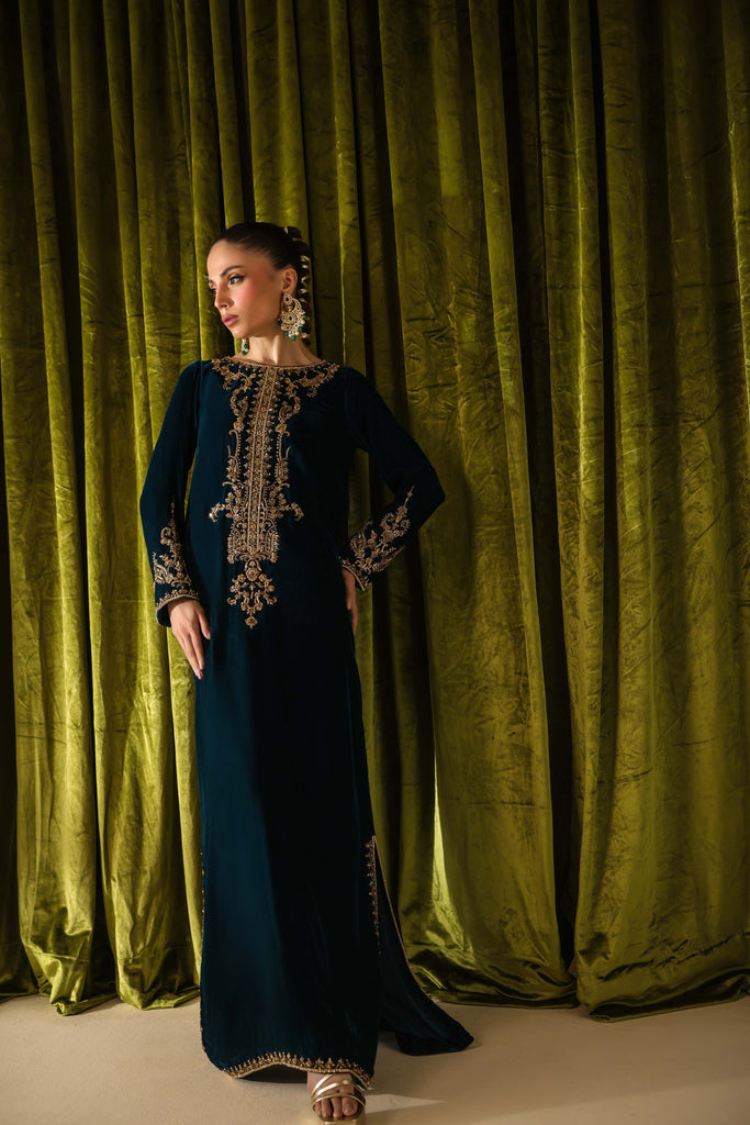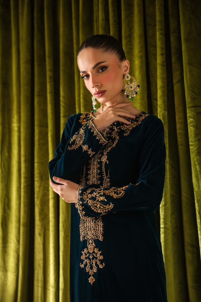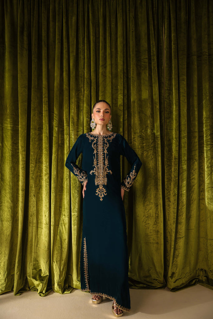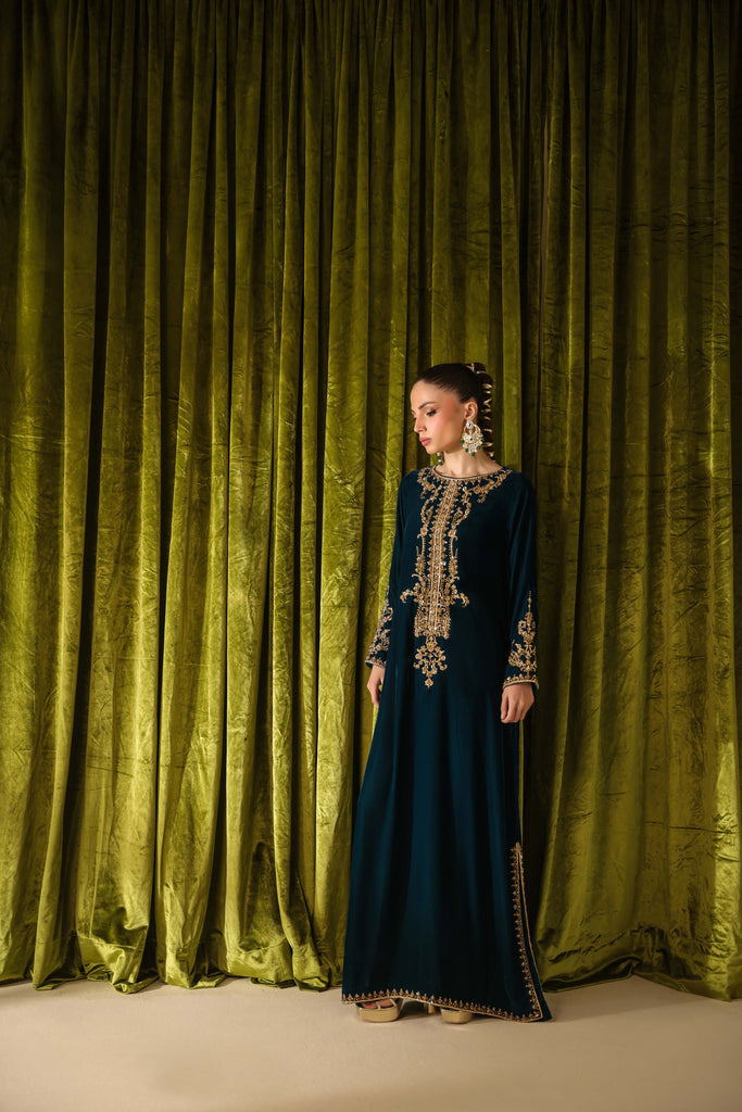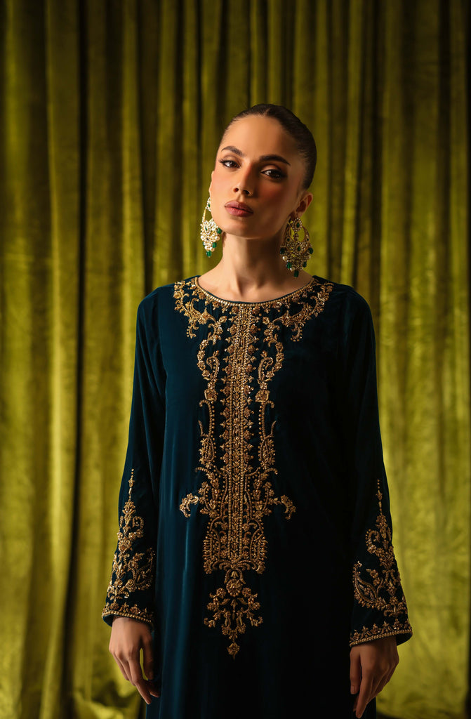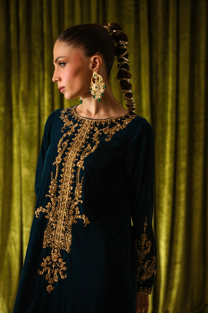 Teal green 9000 velvet maxi style shirt with heavy hand embellishments on neckline, sleeves, daaman and slits. Kora, dabka, rhinestones, sequins, nakshi, cut daana and pearls. Paired with 9000 velvet capri pants of same color. Back slits and daaman also have hand embellishments.