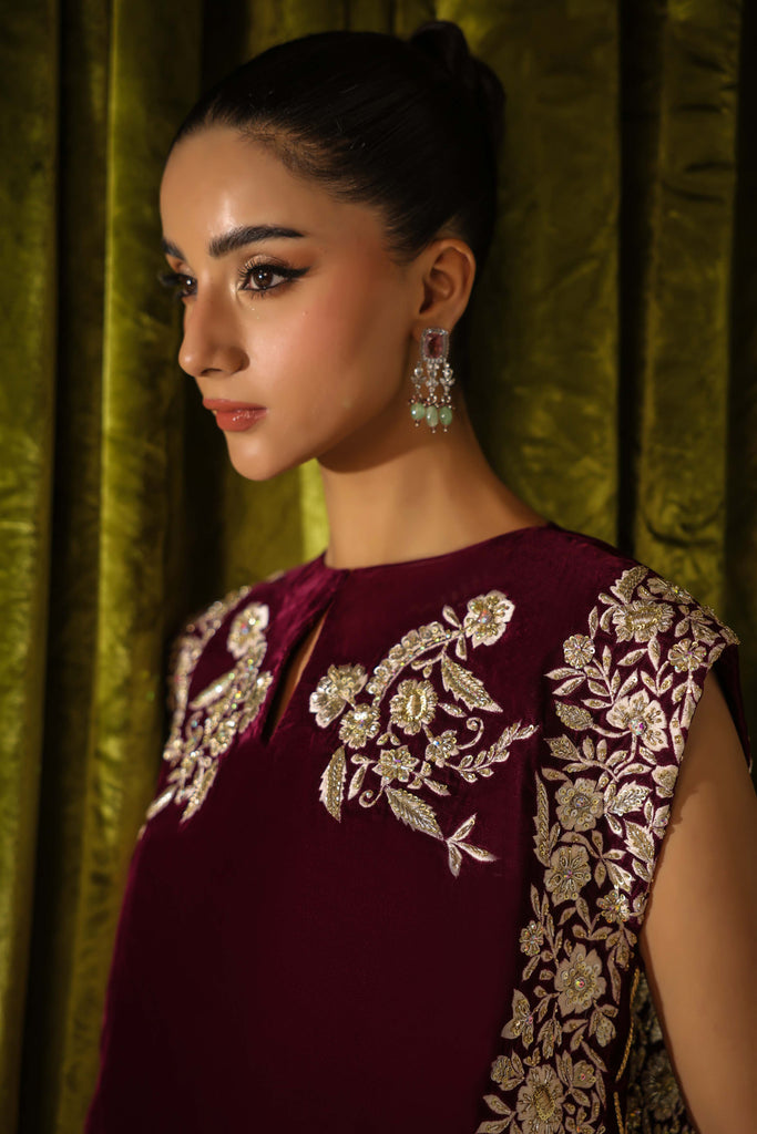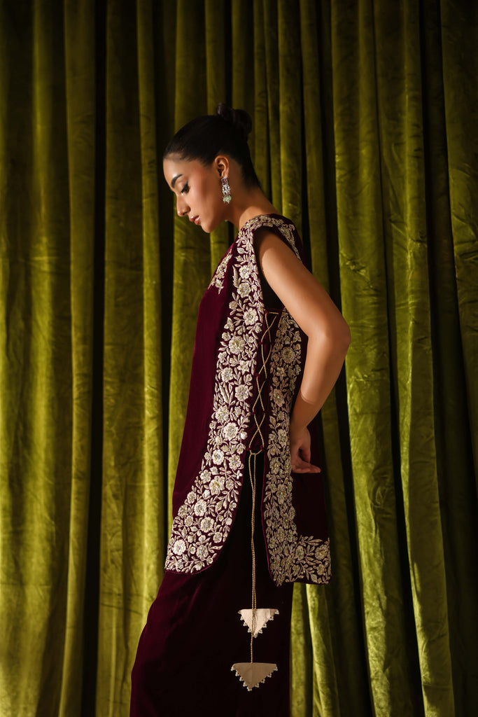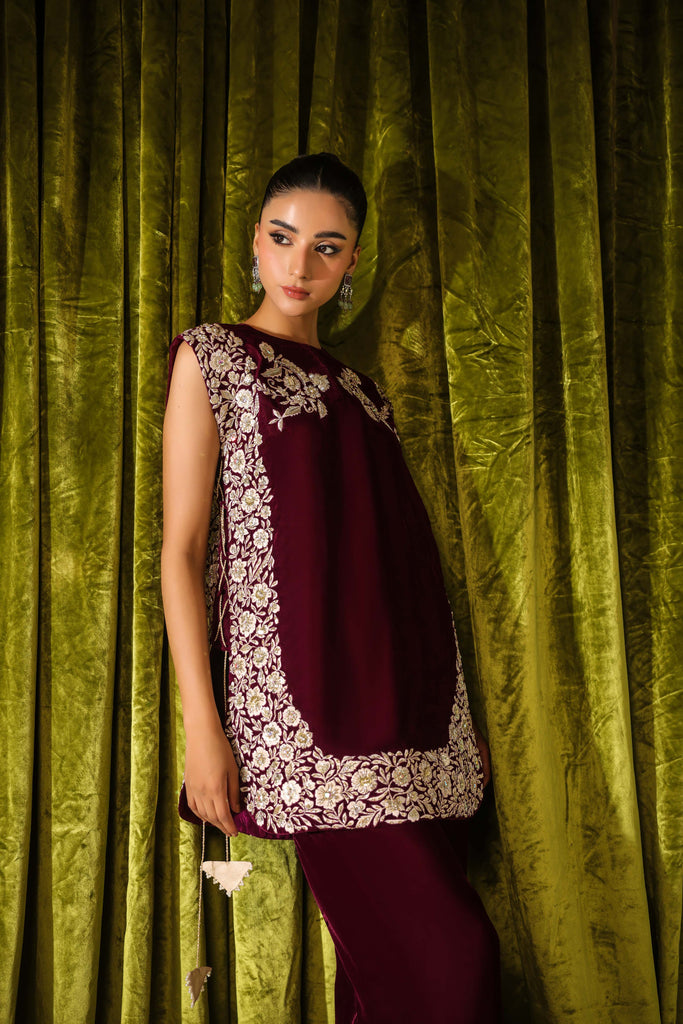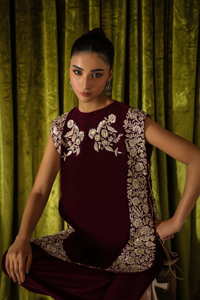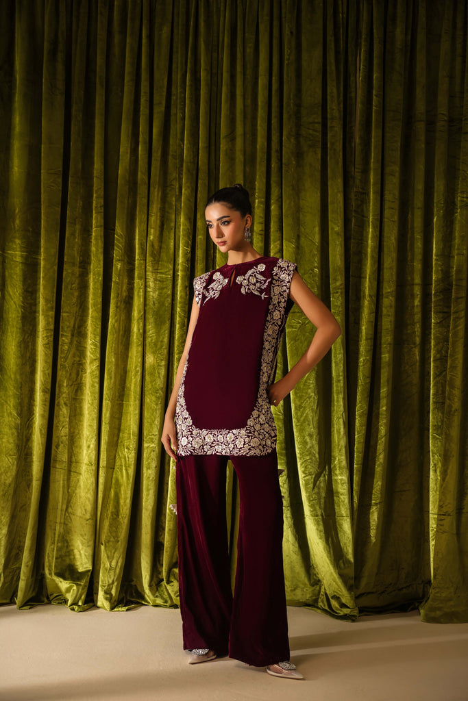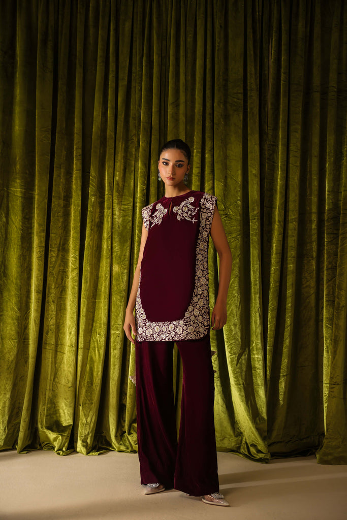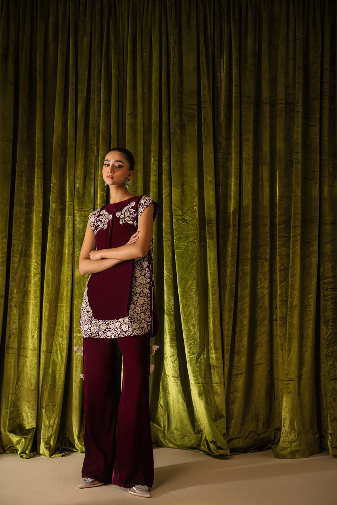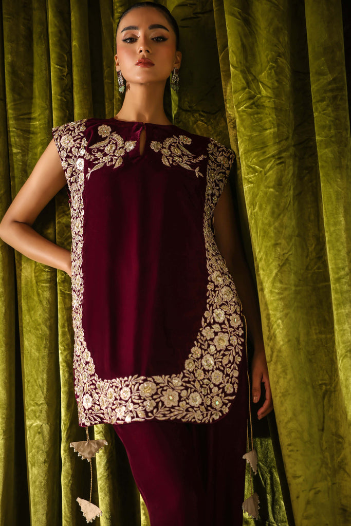 Deep Maroon 9000 velvet short shirt with ivory and gold zari machine embroidery on front and back. Fully hand embellished with kora, dabka, cut daana, gota, rhinestones and pearls. Sides have tassel detailing. Paired with 9000 deep maroon boot leg pants.