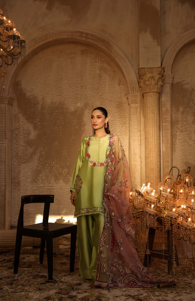 Pure sheesha silk short shirt with multi colored applique work and embroidery on neckline, sleeves and daaman. Hand embellished with sequins. Paired with sheesha silk farshi shalwar.