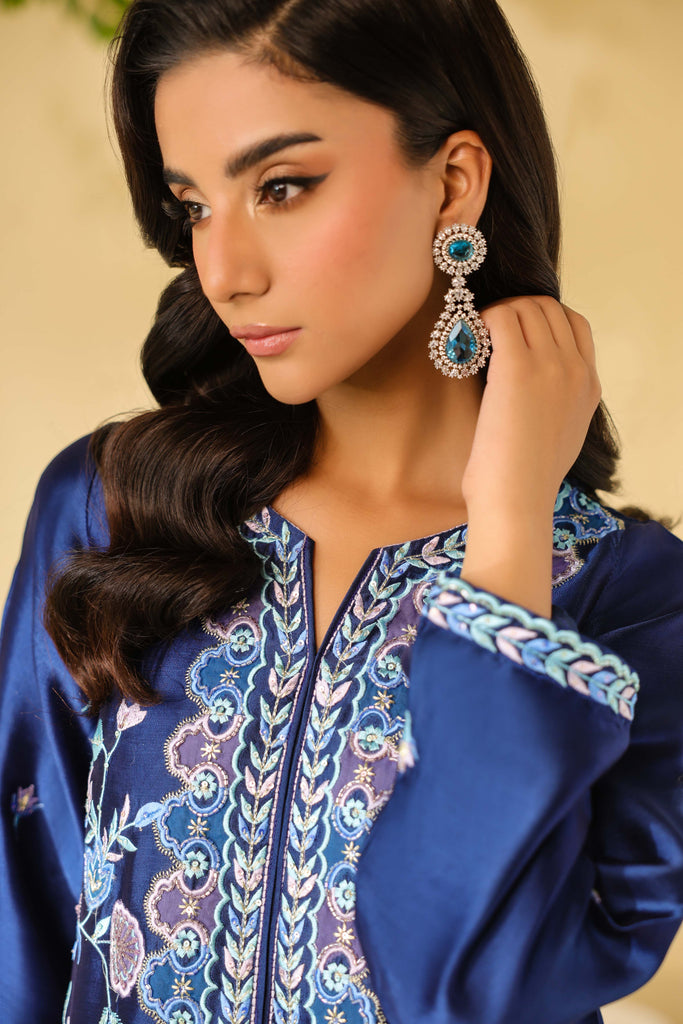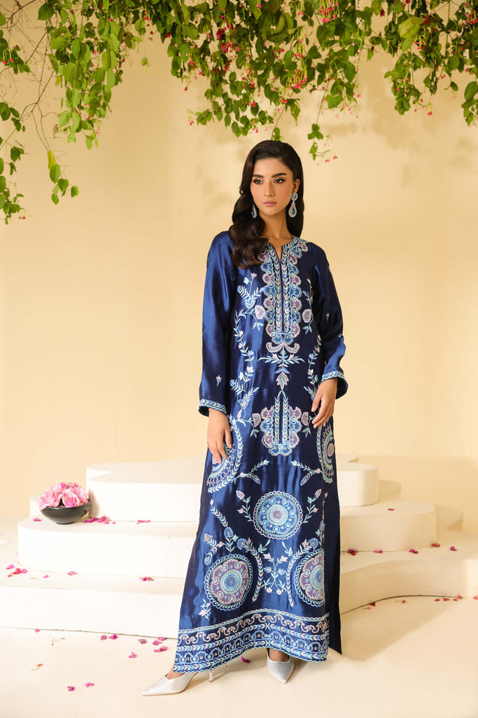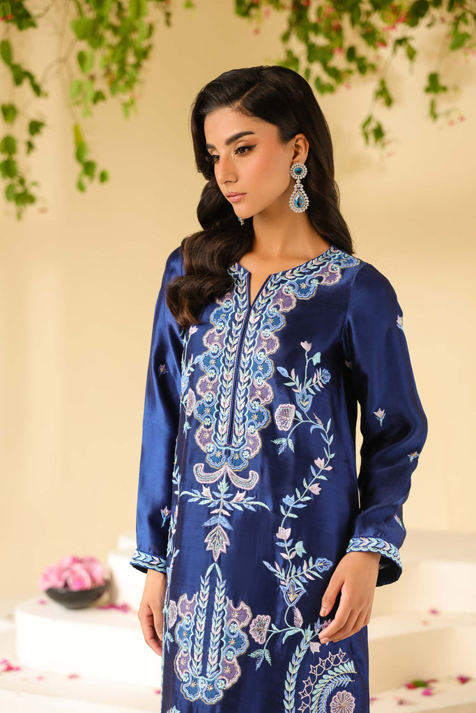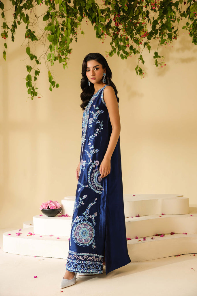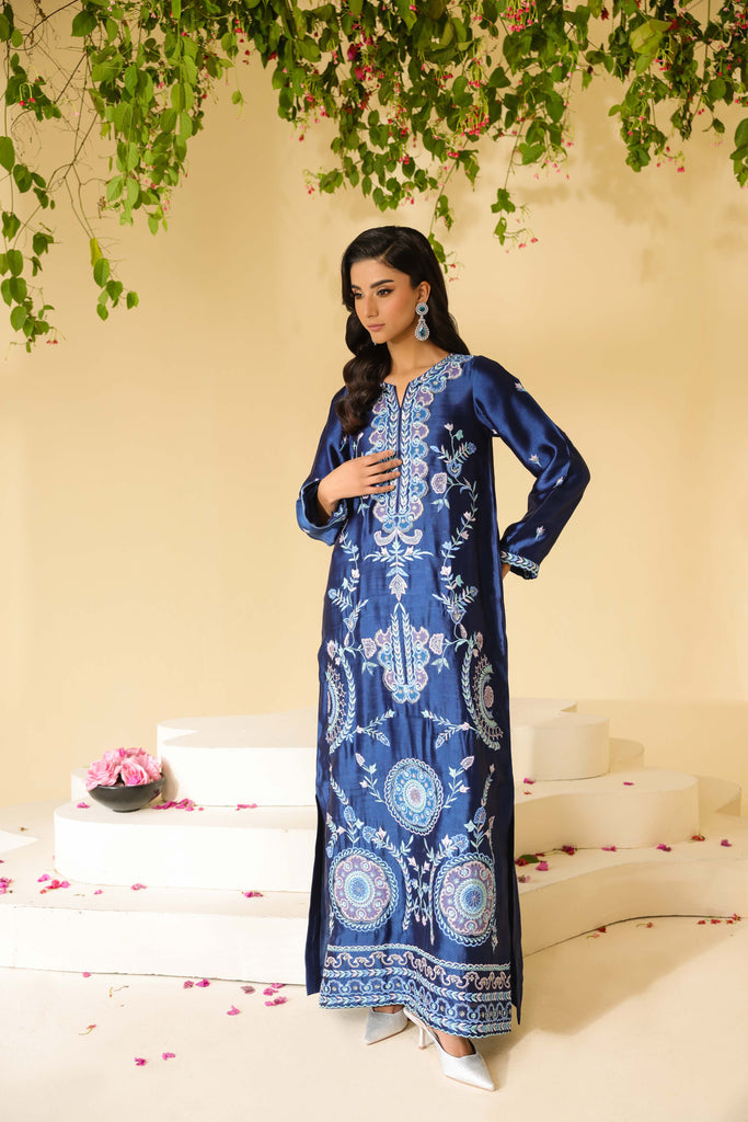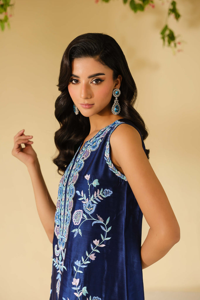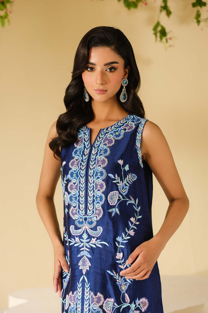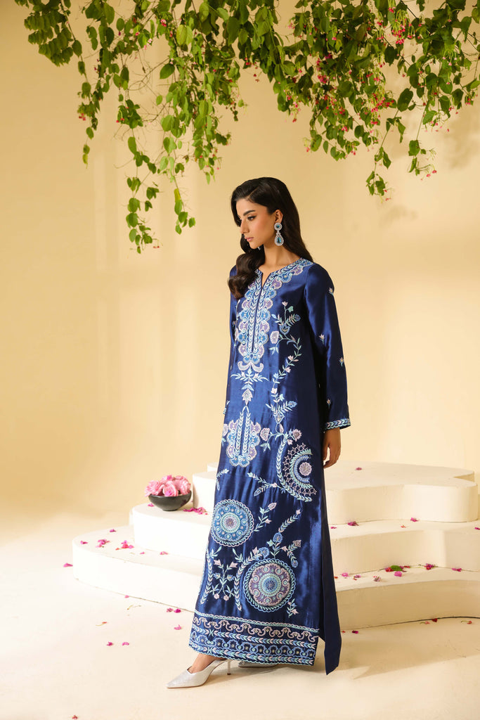 Navy Blue sheesha silk maxi style shirt full of embroidery and applique work. Hand embellishments all over front and sleeves. Cut daana, sequins amd rhinestones. Paired with same sheesha silk capri pants.