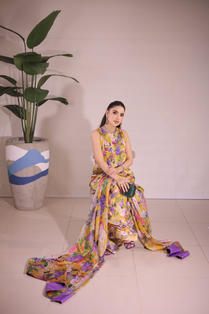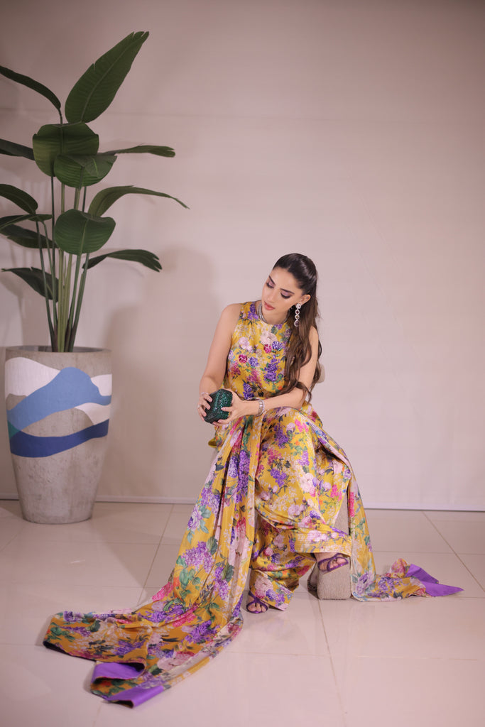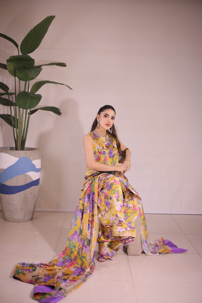 Korean Charmeuse digital print short shirt with sequins embellishments all over the front and sleeves. Paired with a gorgeous same printed khuli shalwar. Chiffon Digital print dupatta with silk finishing.