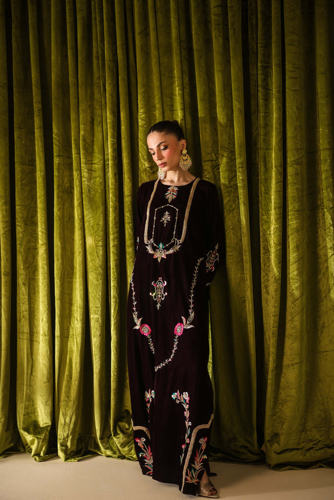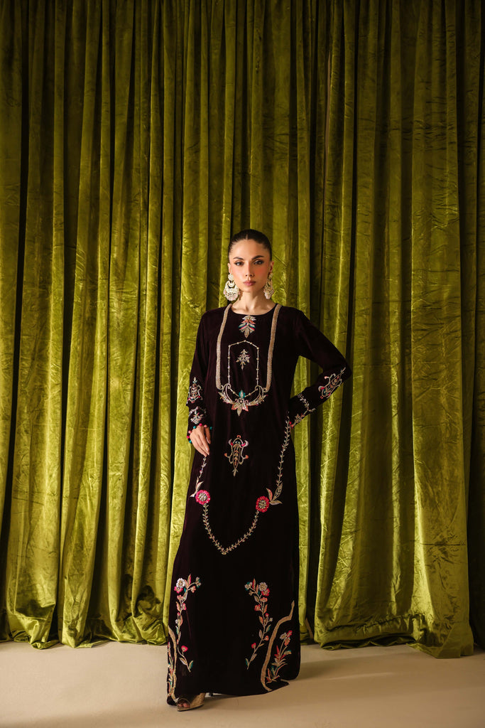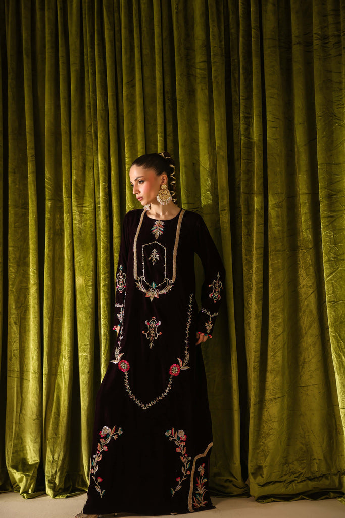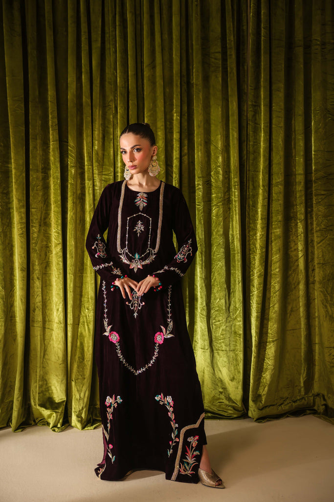 Deep purple 9000 velvet long maxi style shirt fully multi colored machine embroidered maxi with heavy hand embellishments all over. Kora, dabka, gota, rhinestones, sequins and pearls. Colorful resham hanging detailing on sleeves. Paired with same velvet capri pants.
