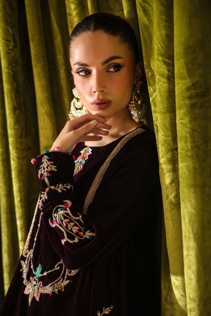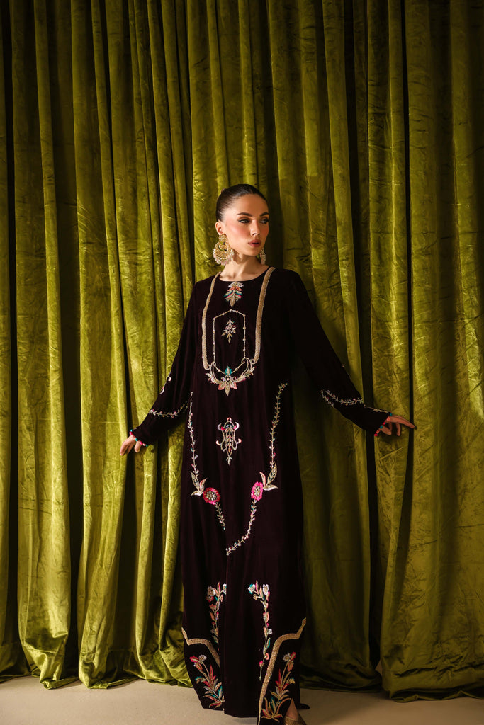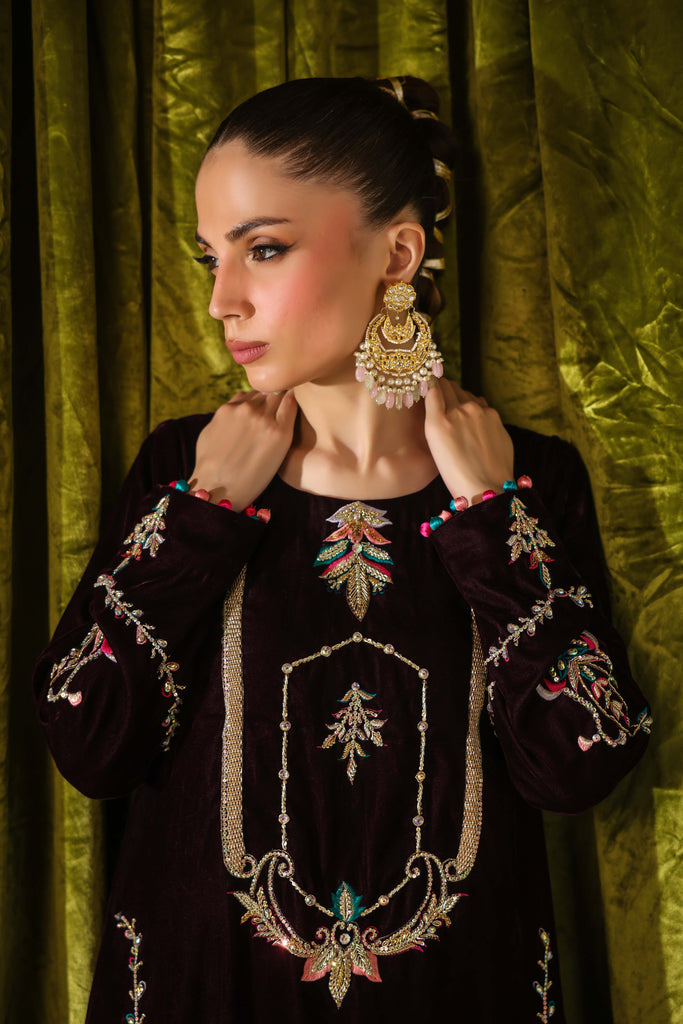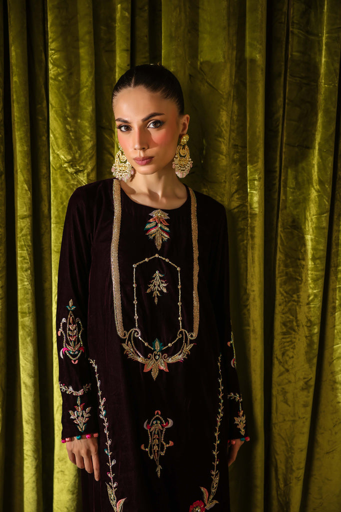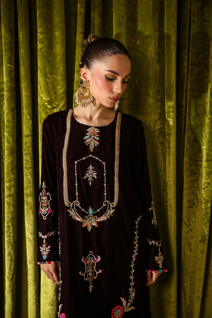 Deep purple 9000 velvet long maxi style shirt fully multi colored machine embroidered maxi with heavy hand embellishments all over. Kora, dabka, gota, rhinestones, sequins and pearls. Colorful resham hanging detailing on sleeves. Paired with same velvet capri pants.