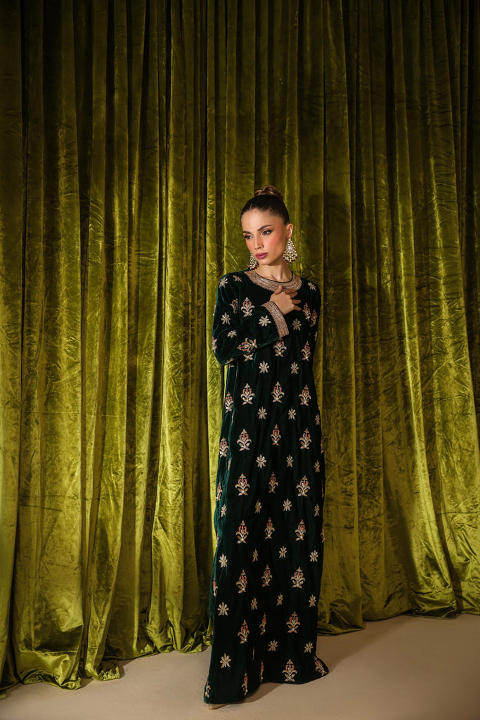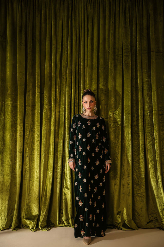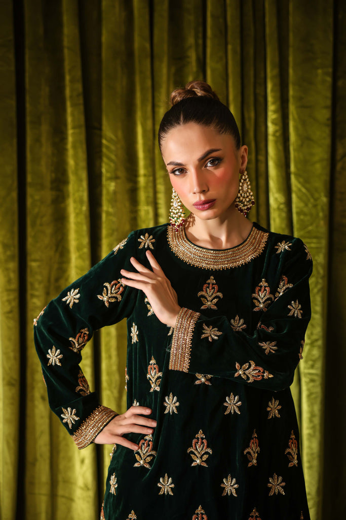 Deep bottle green 9000 velvet long maxi style shirt fully hand embellished with kora, dabka, nakshi, sequins, rhinestones and pearls. Heavily hand embellished neckline, full front and sleeves. Tassel detailing on slits. Paired with same velvet capri pants.