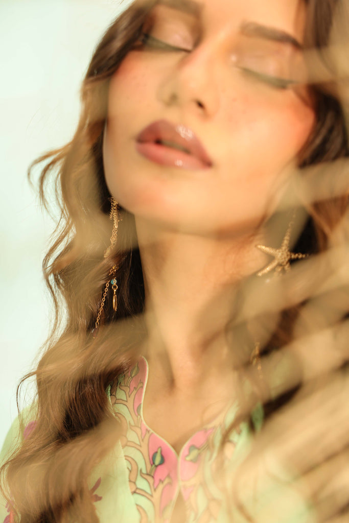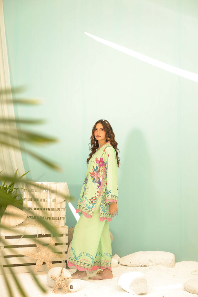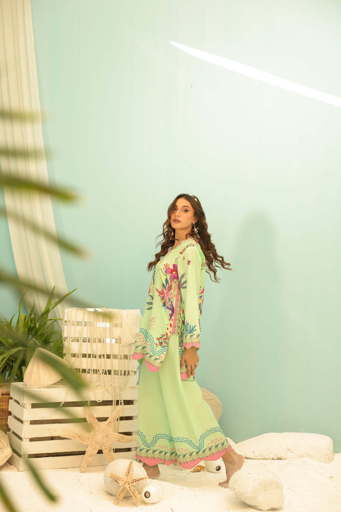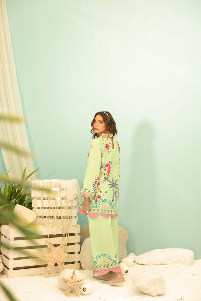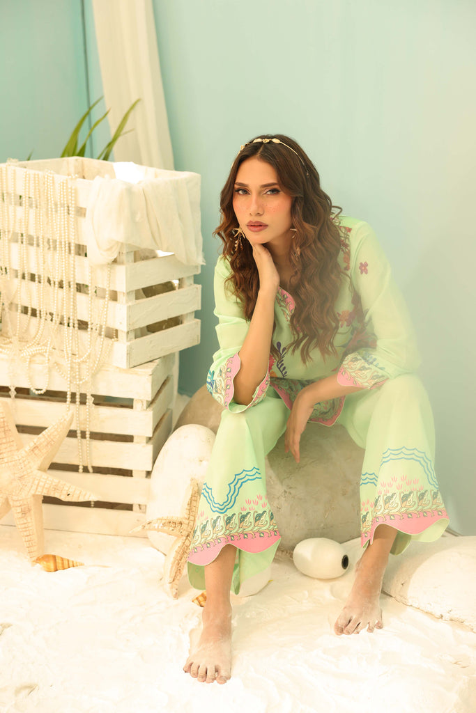 Lawn digital print shirt with a scalloped neckline, sleeves amd daaman. Back has a v neck detailing. Paired with scalloped digital lawn culottes.