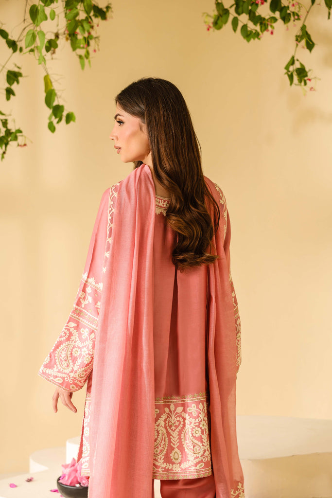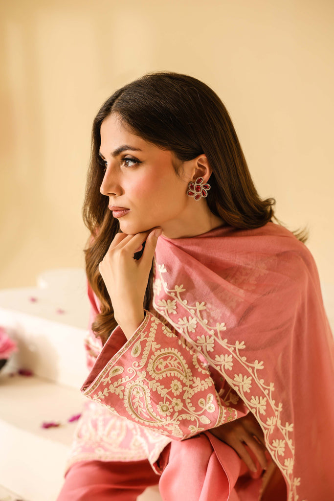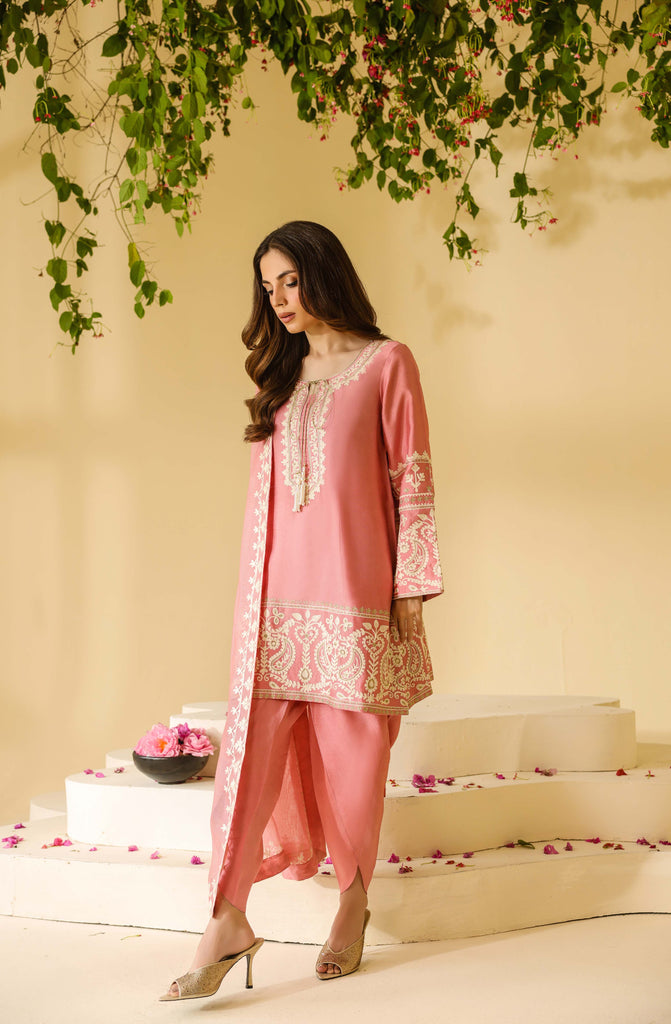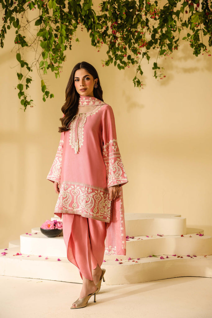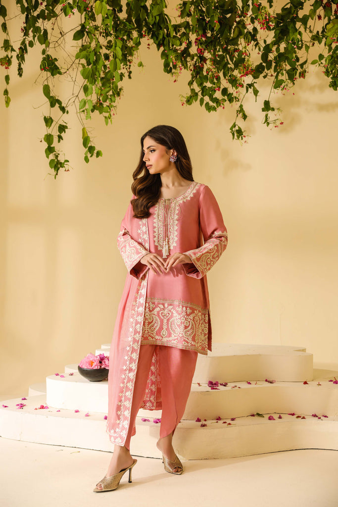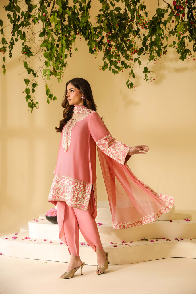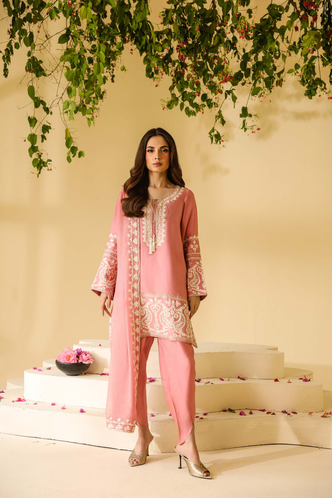 Sheesha rawsilk shirt fully embroidered with ari work on neckline, sleeves and daaman. Paired with same fabric tulip pants. Dupatta is khaadi net with ari embroidery on all four sides.