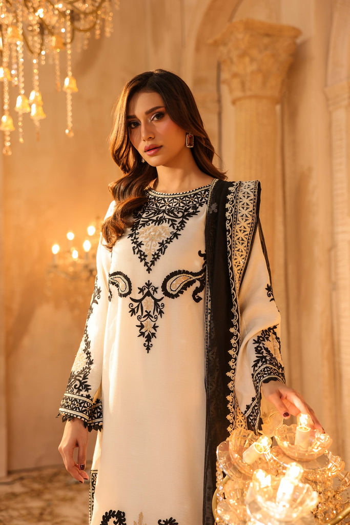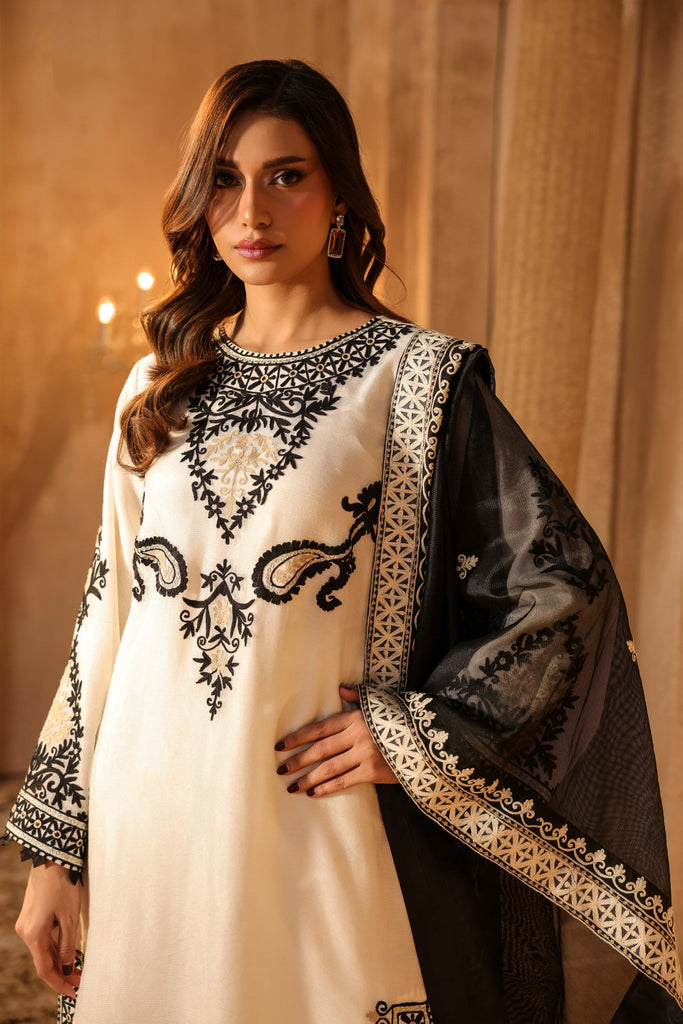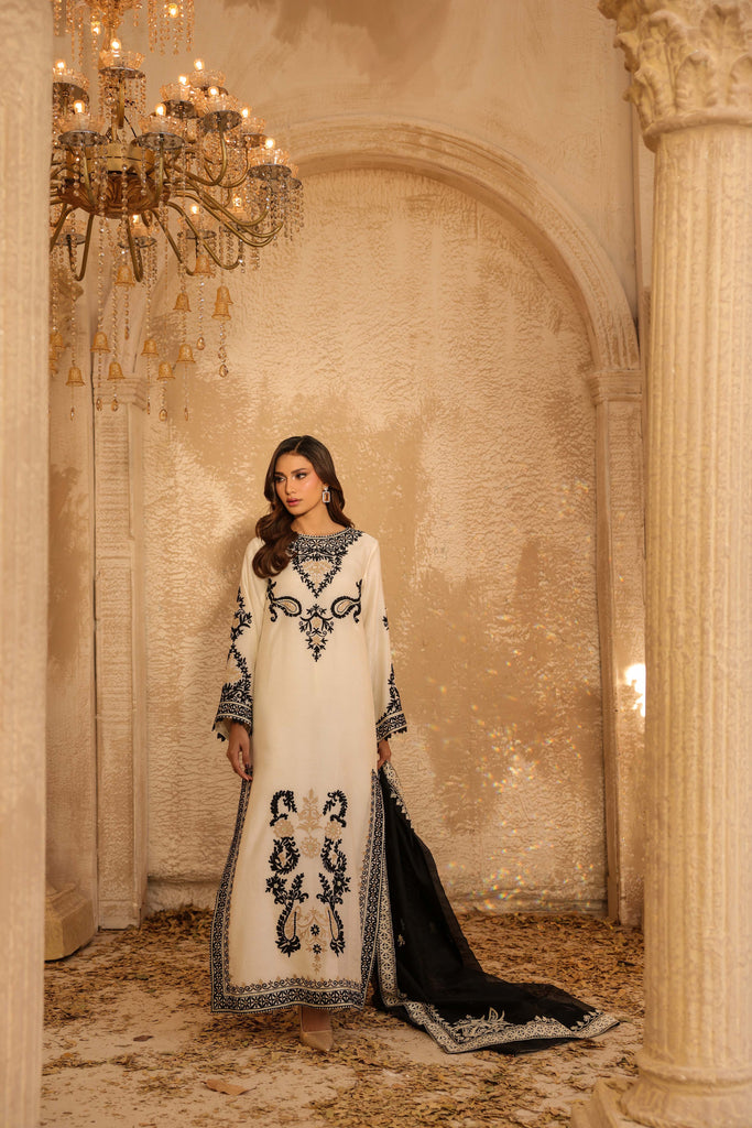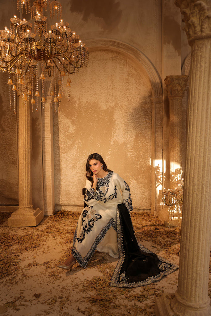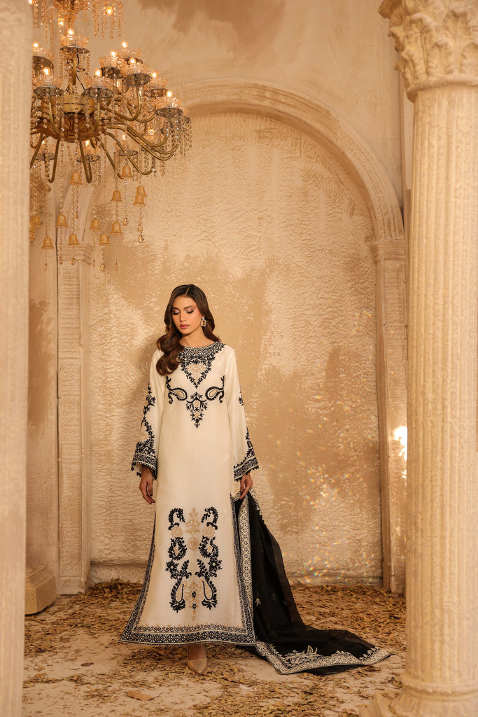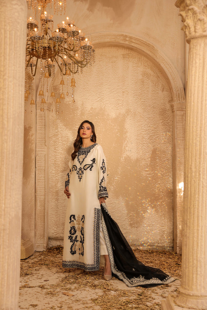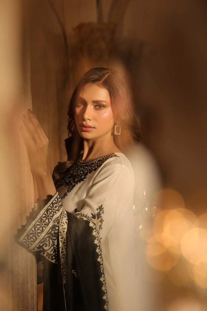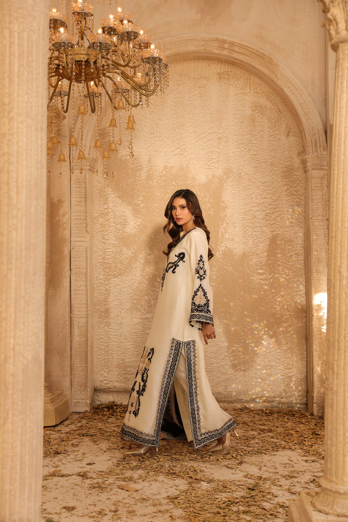 Khaadi net long maxi style shirt full of ari embroidery work on neckline, sleeves, daaman and back. Paired with a khaadi net dupatta fully ari embroidered on all four sides. Paired with khaadi silk izaar pants.