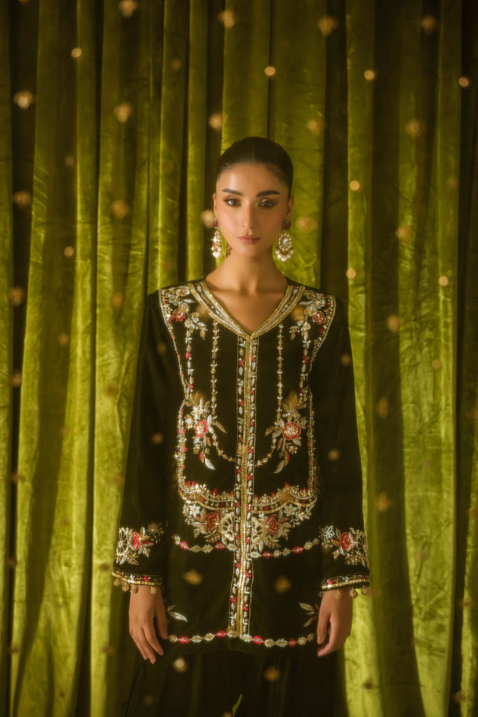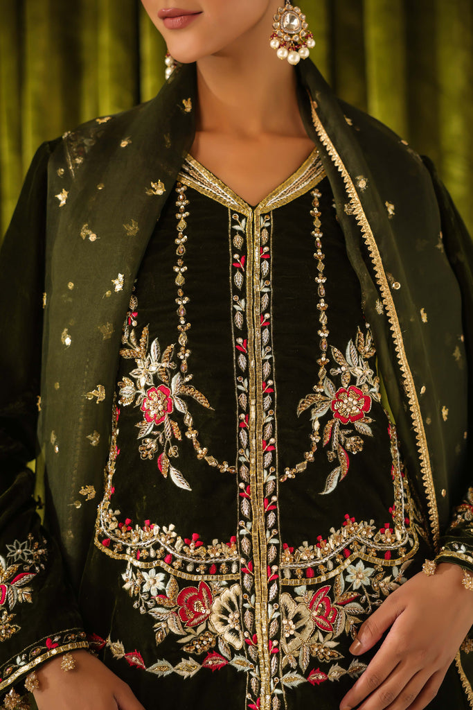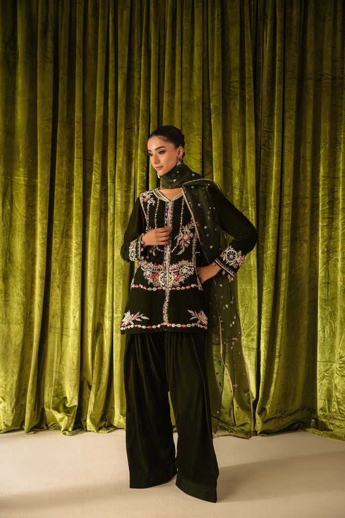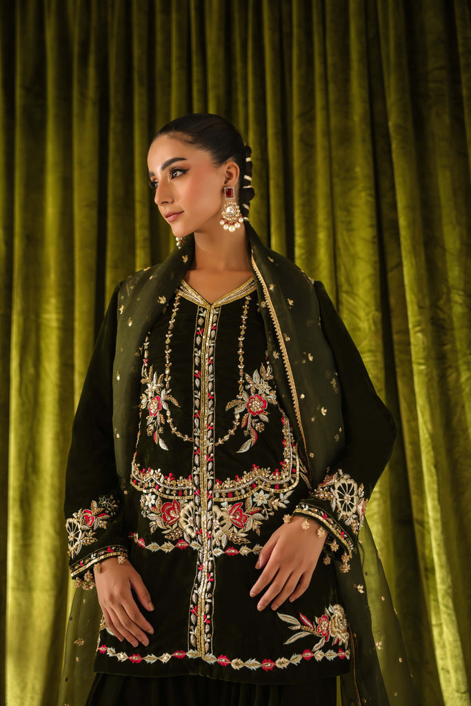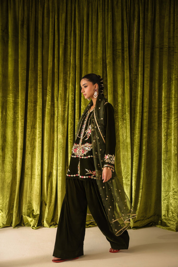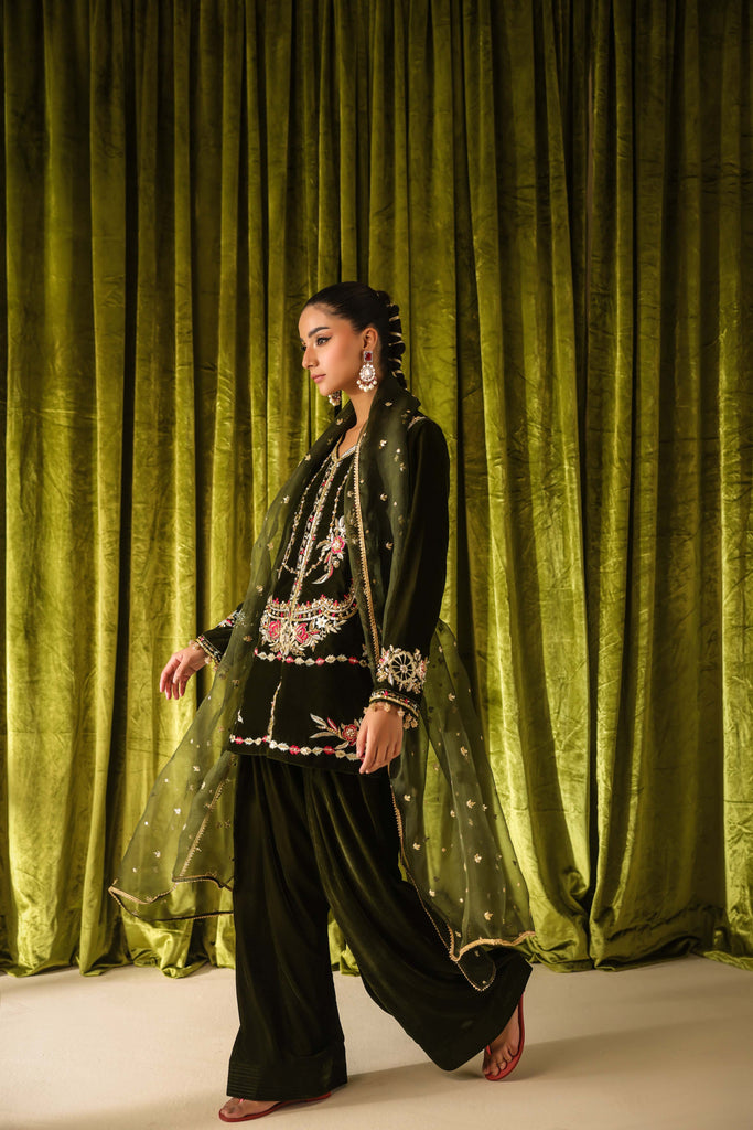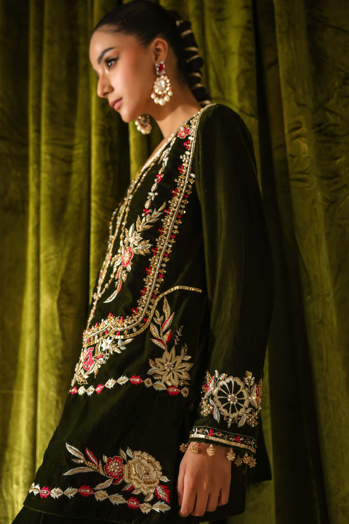 Dark Mehndi green 9000 velvet fully embroidered short shirt and heavily hand embellished all over with gota, kora, dabka, sequins, rhinestones and pearls. Paired with the same 9000 velvet farshi shalwar.