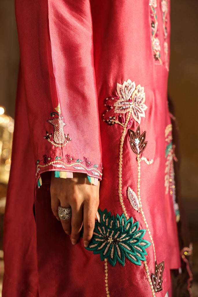 Short sheesha silk shirt with applique work and multi embroidery on neckline, sleeves and daaman. Finished with organza loops on sleeves and daaman. Paired with sheesha silk boot leg pants.