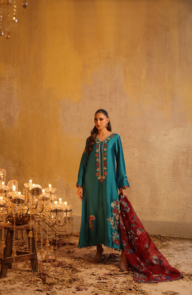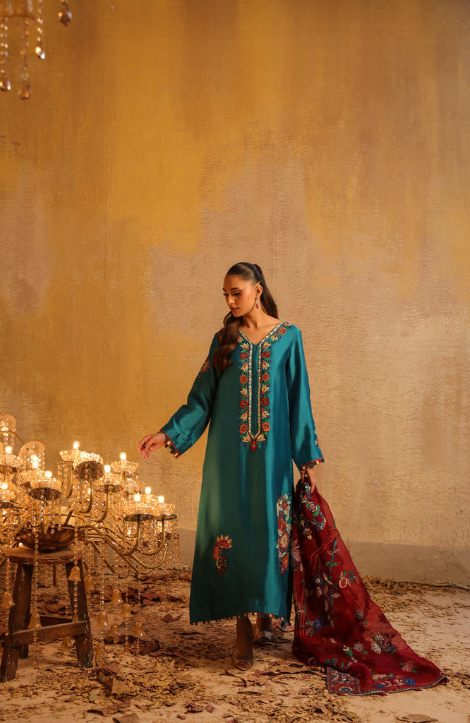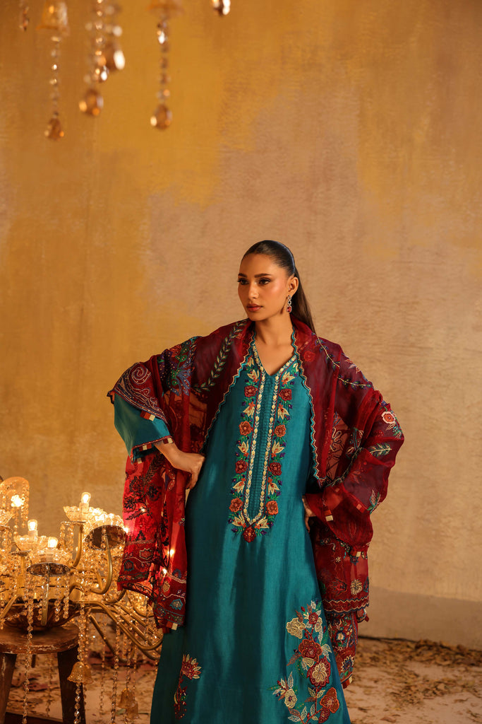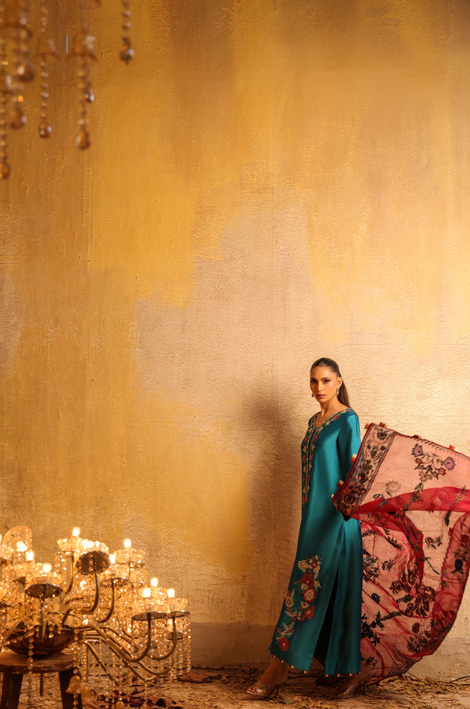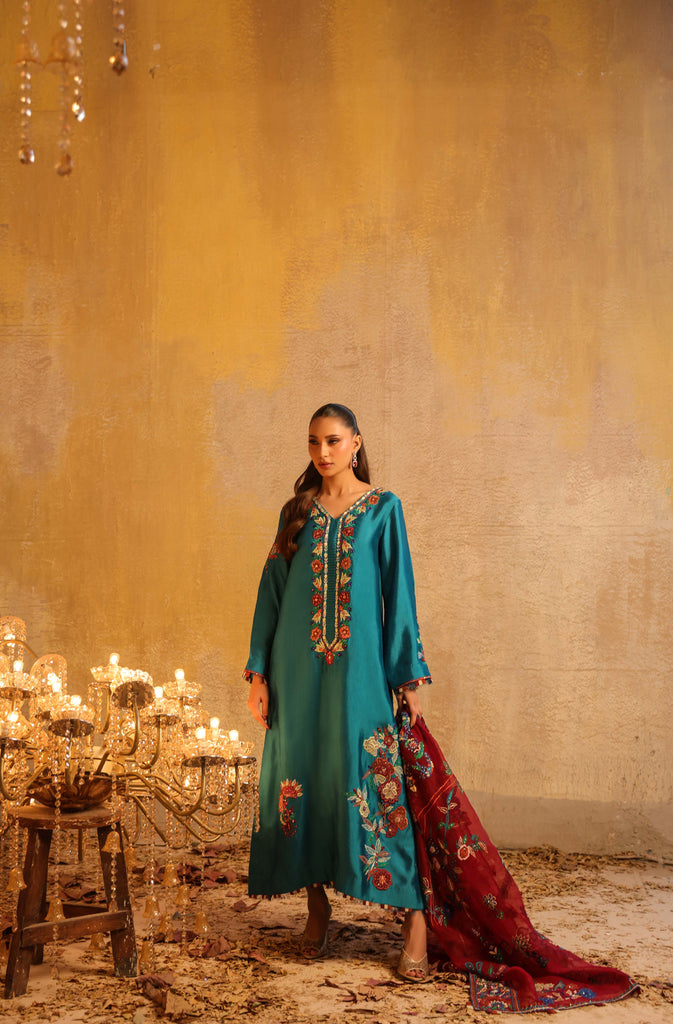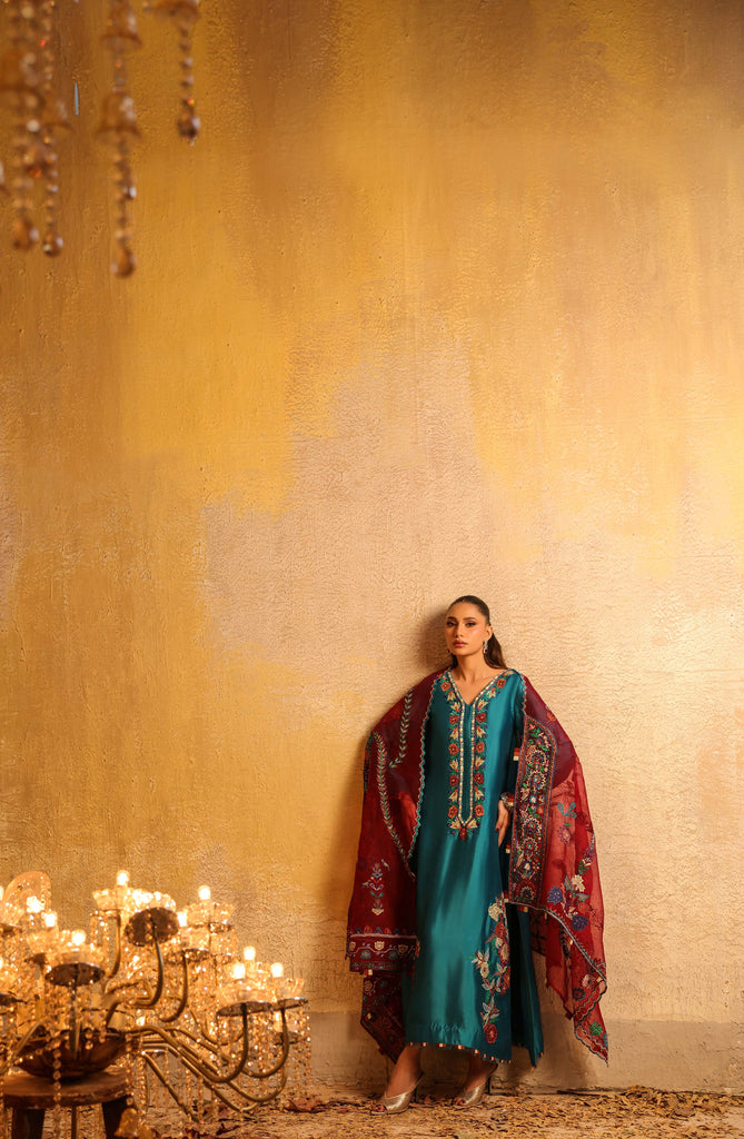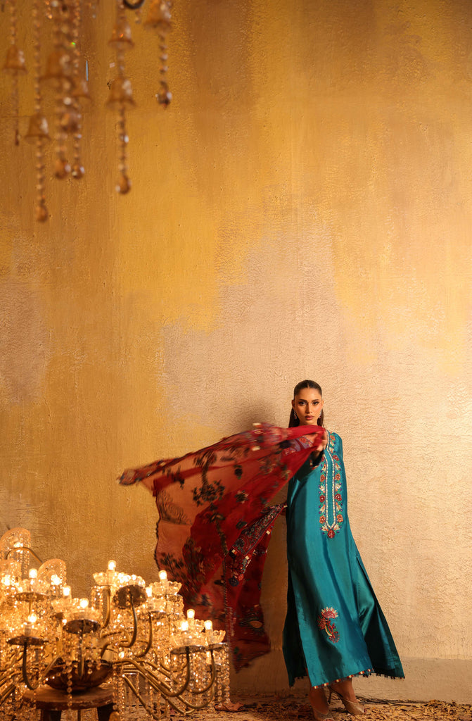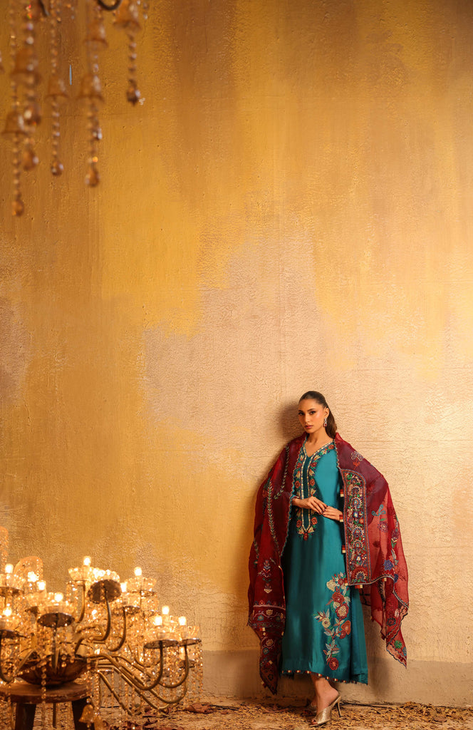 Dupatta is pure kethan organza fully embroidered with mirror work and hand embellished with sequins all overs.