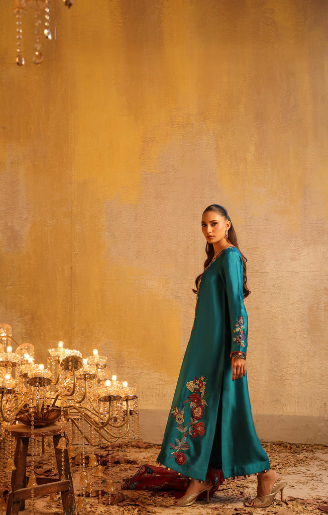 Pure sheesha silk long A line shirt with multi colored applique work neckline, sleeves and daaman. Hand embellished with sequins work. Sleeves are finished with three colored organza triangles. Paired with sheesha silk capri pants.